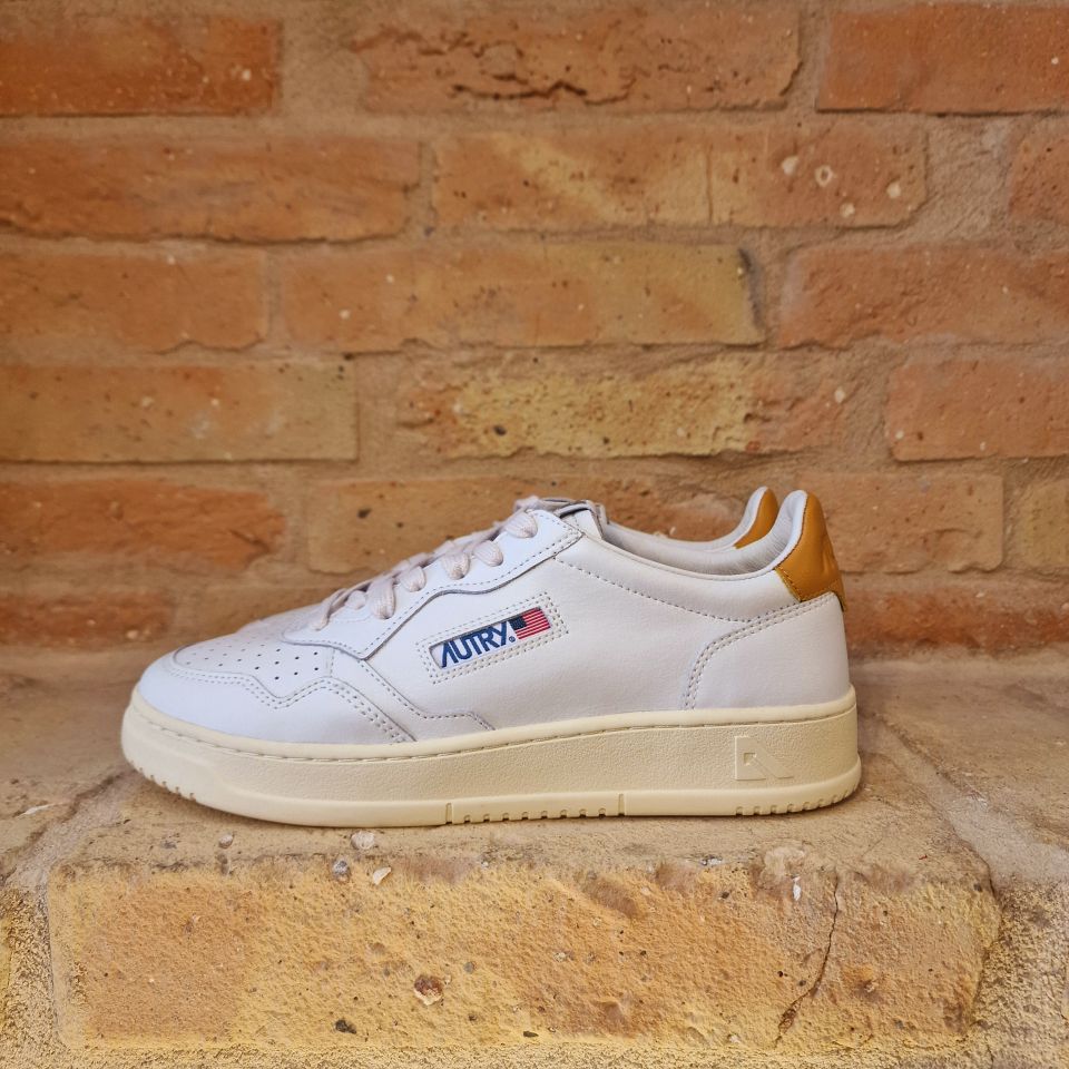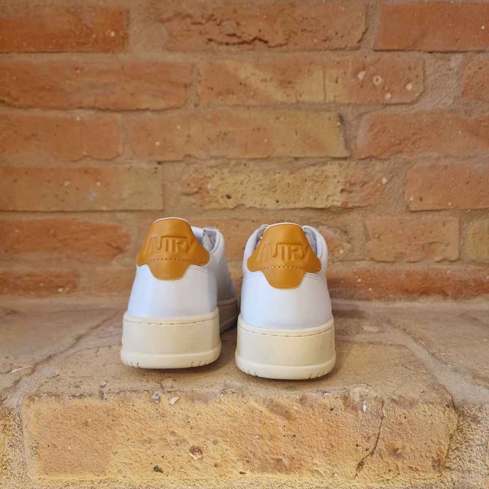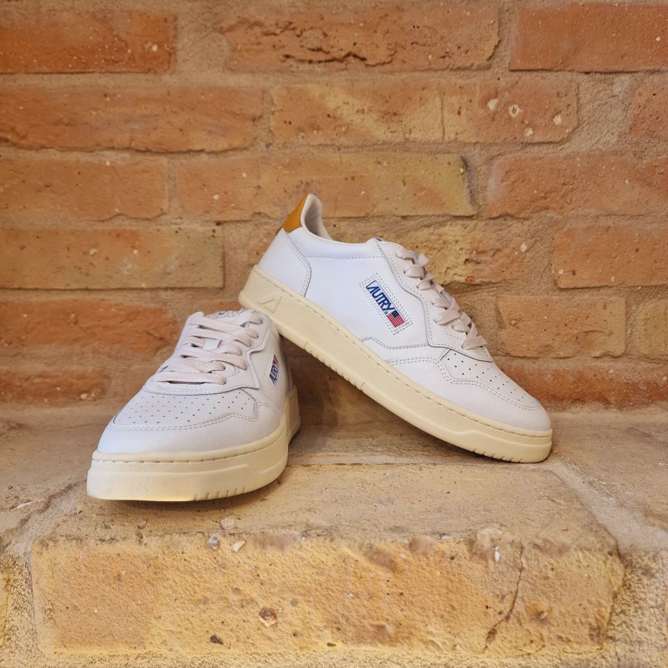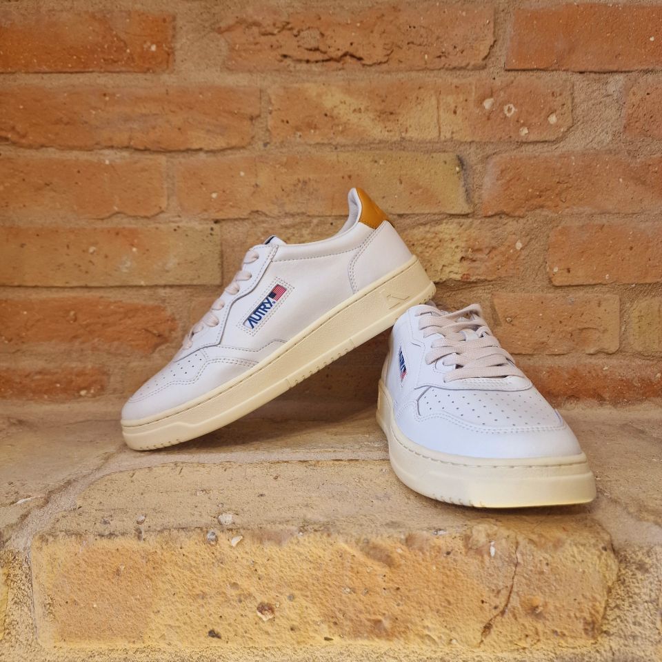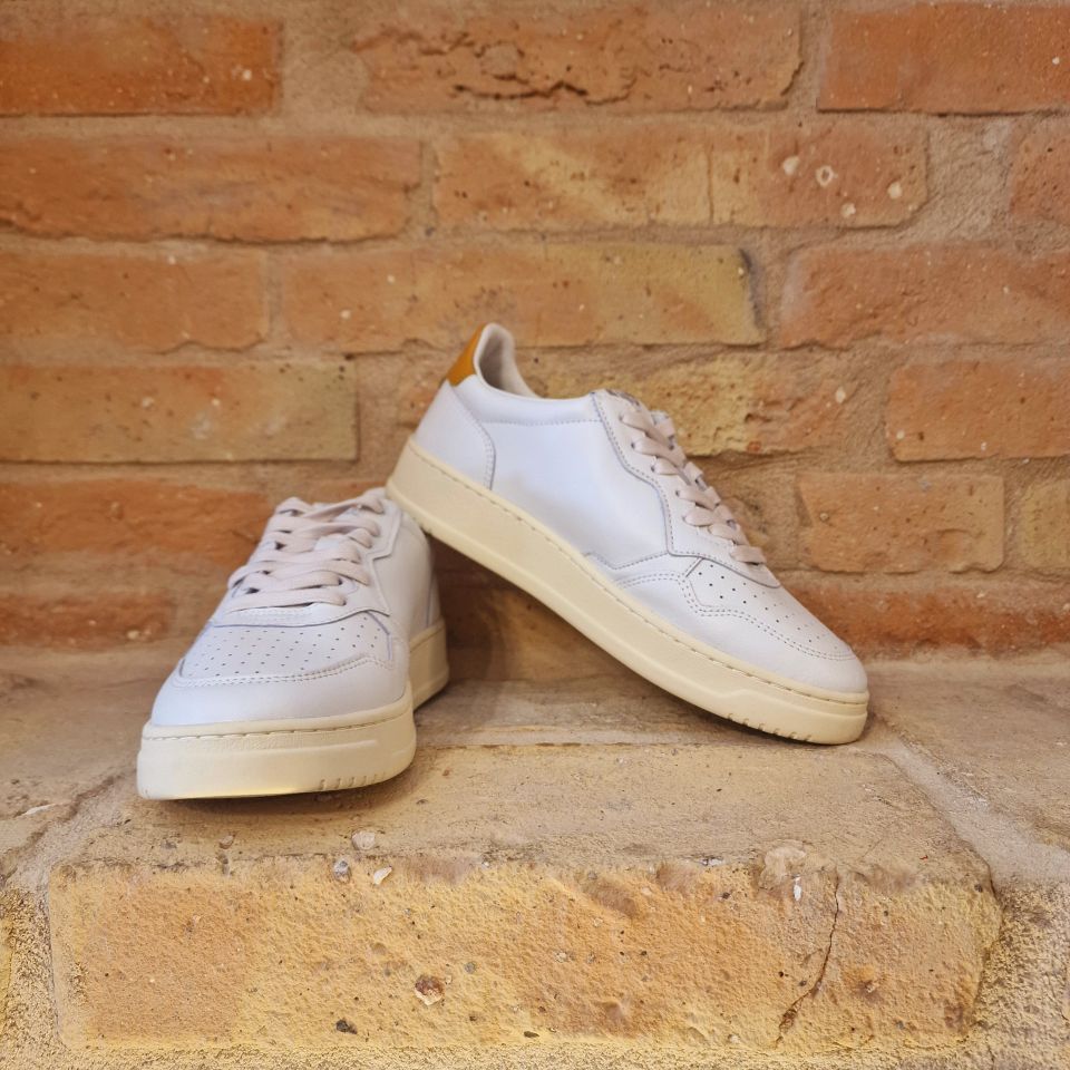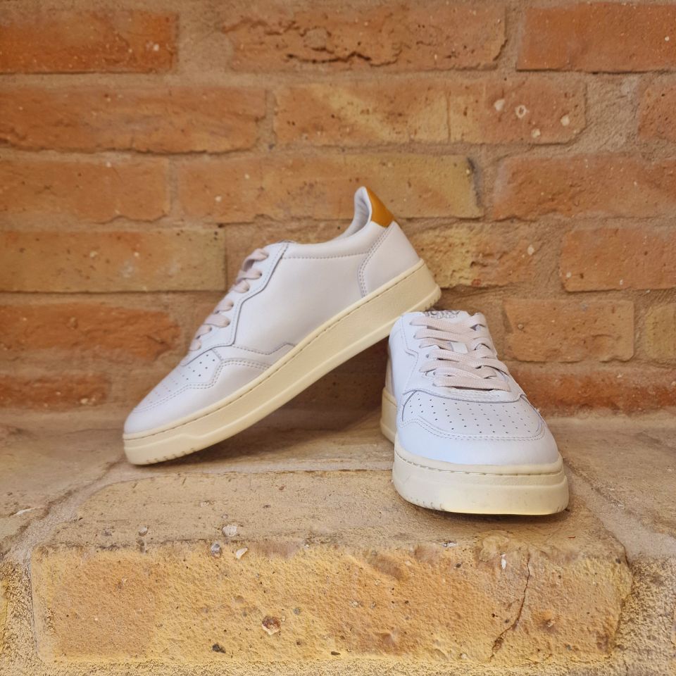 Sneakers in pelle di vitello bianca e tallone giallo.