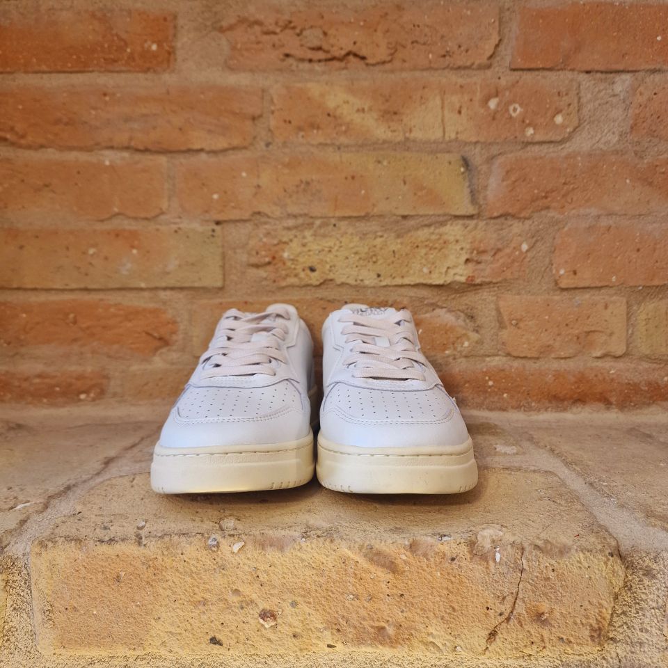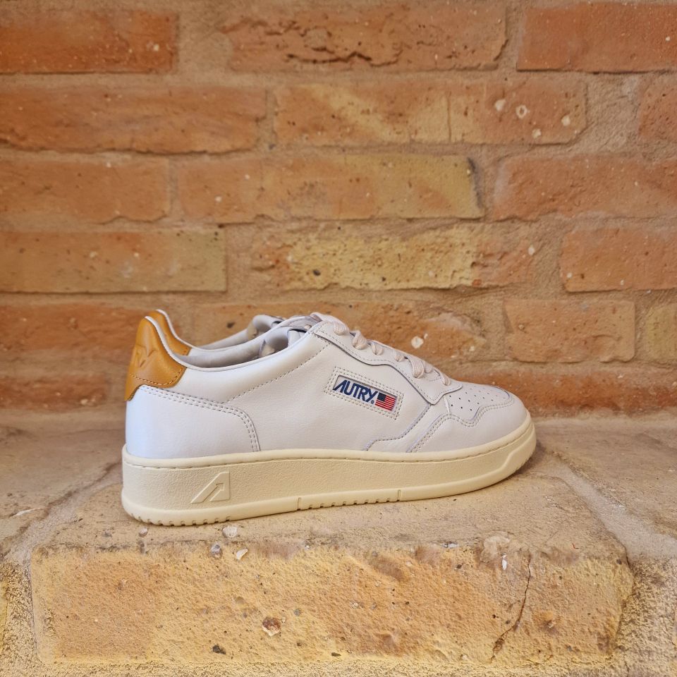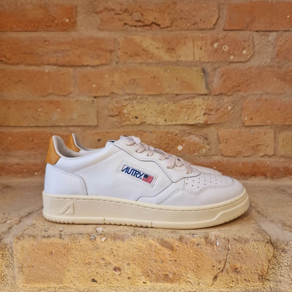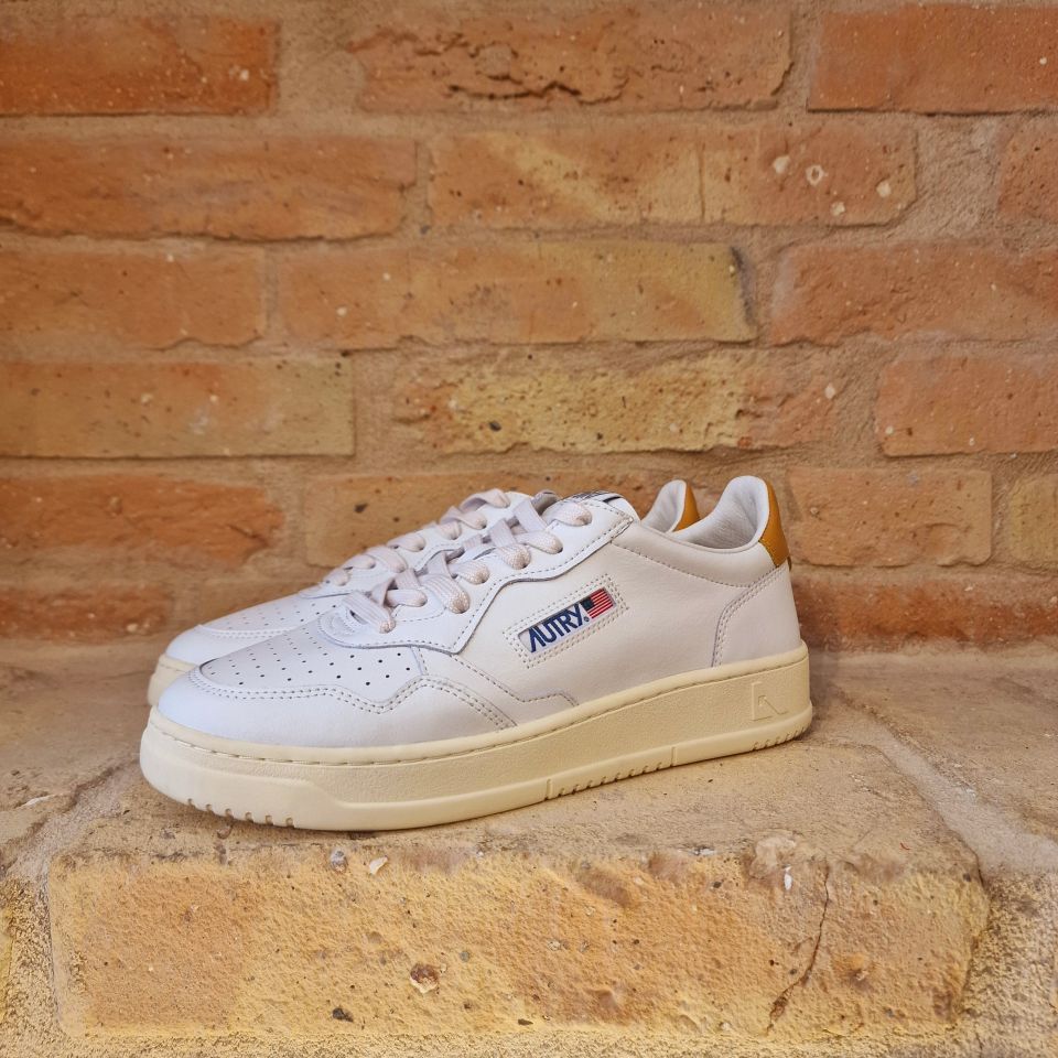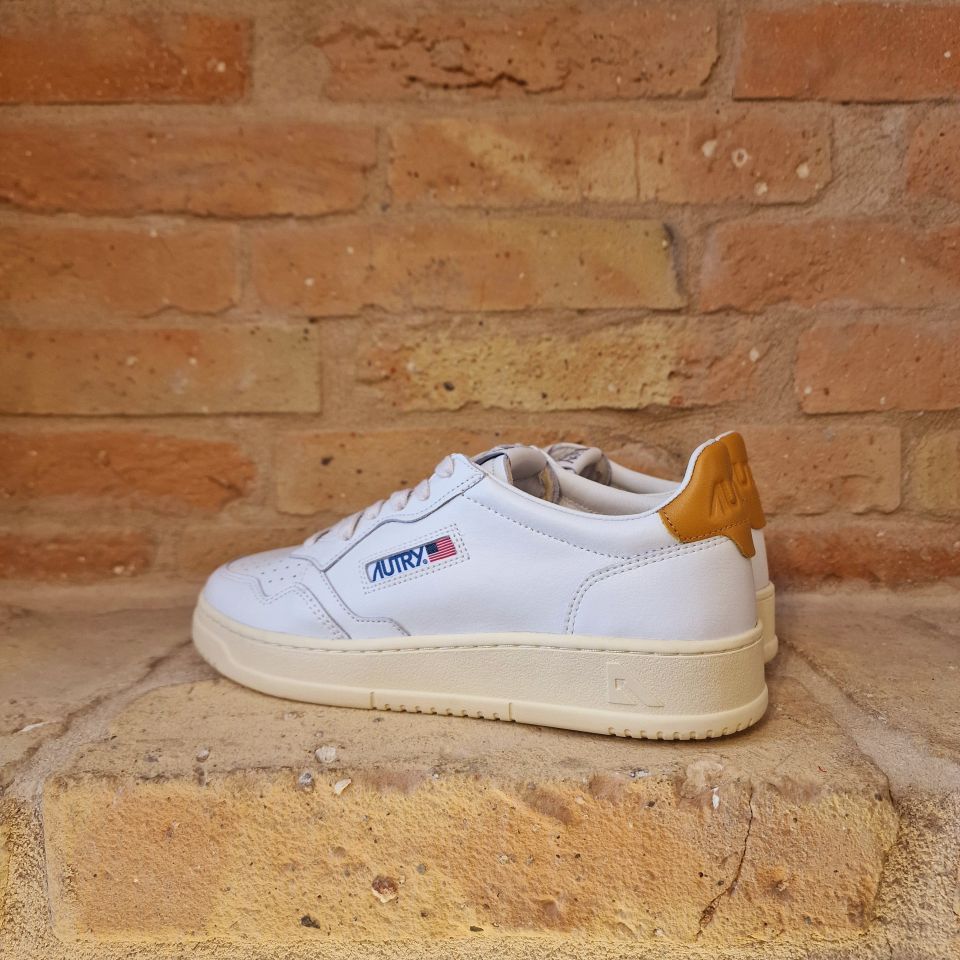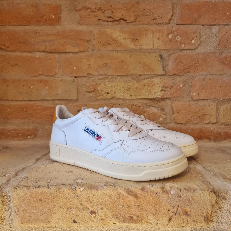 Sneakers in pelle di vitello bianca e tallone giallo.