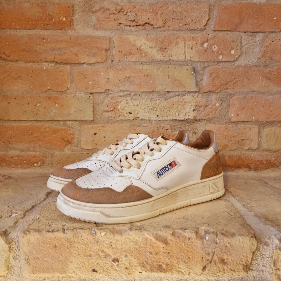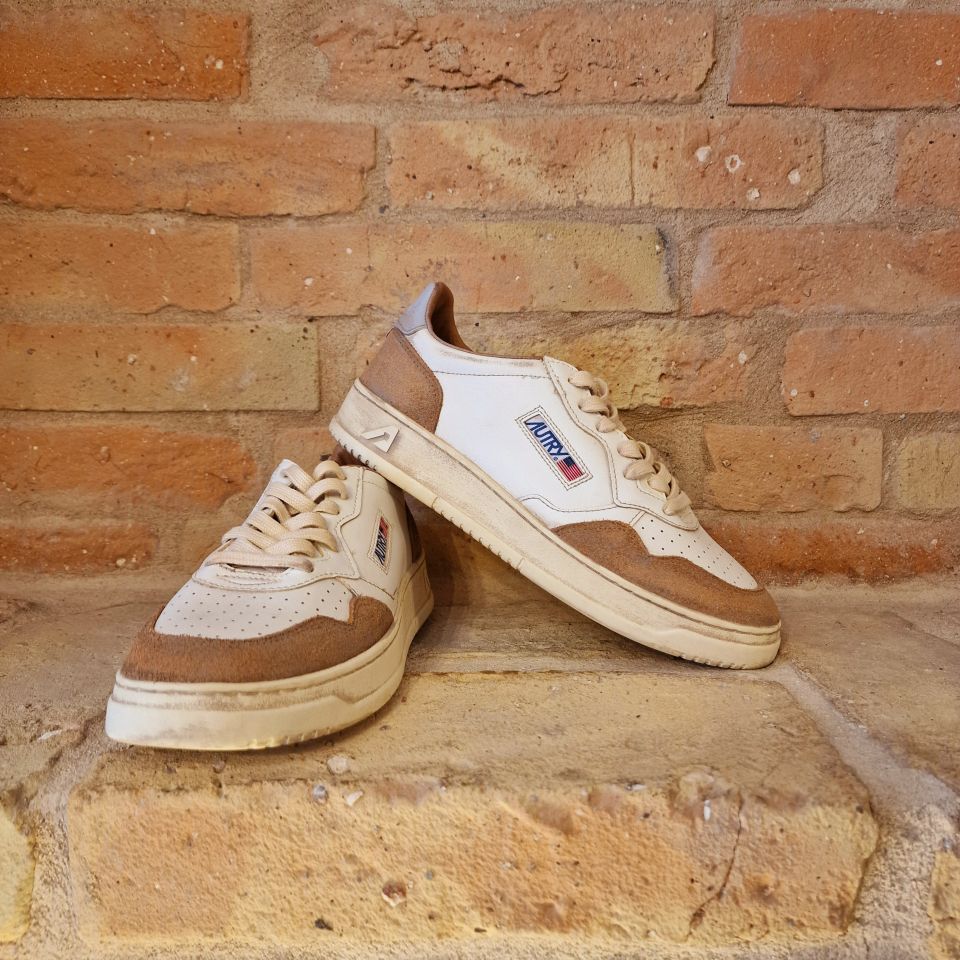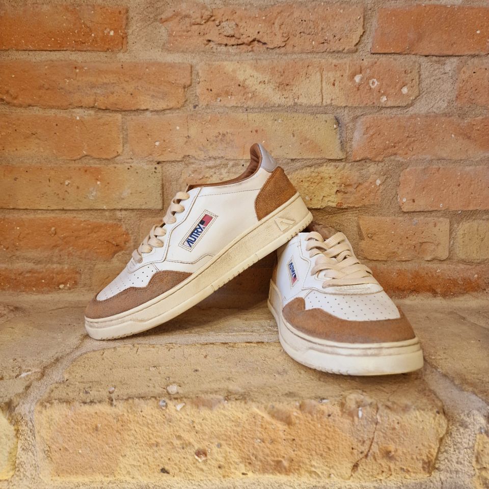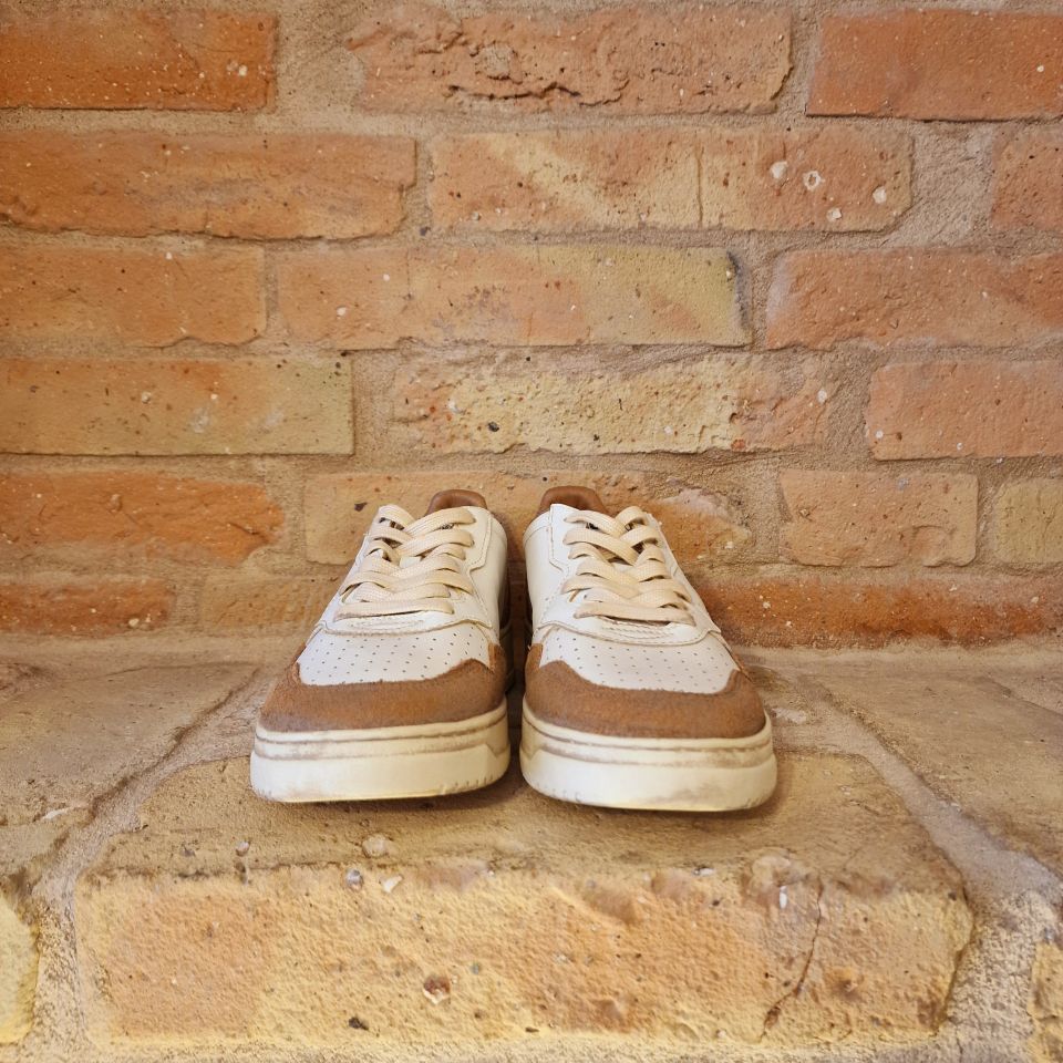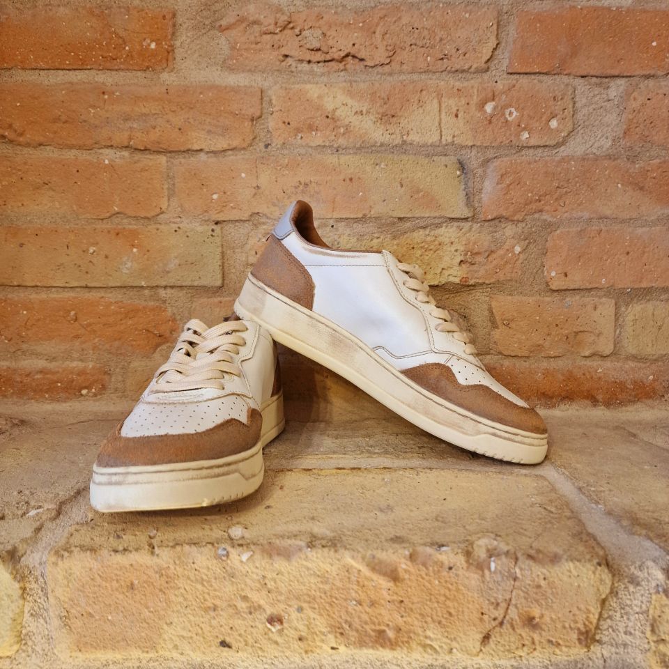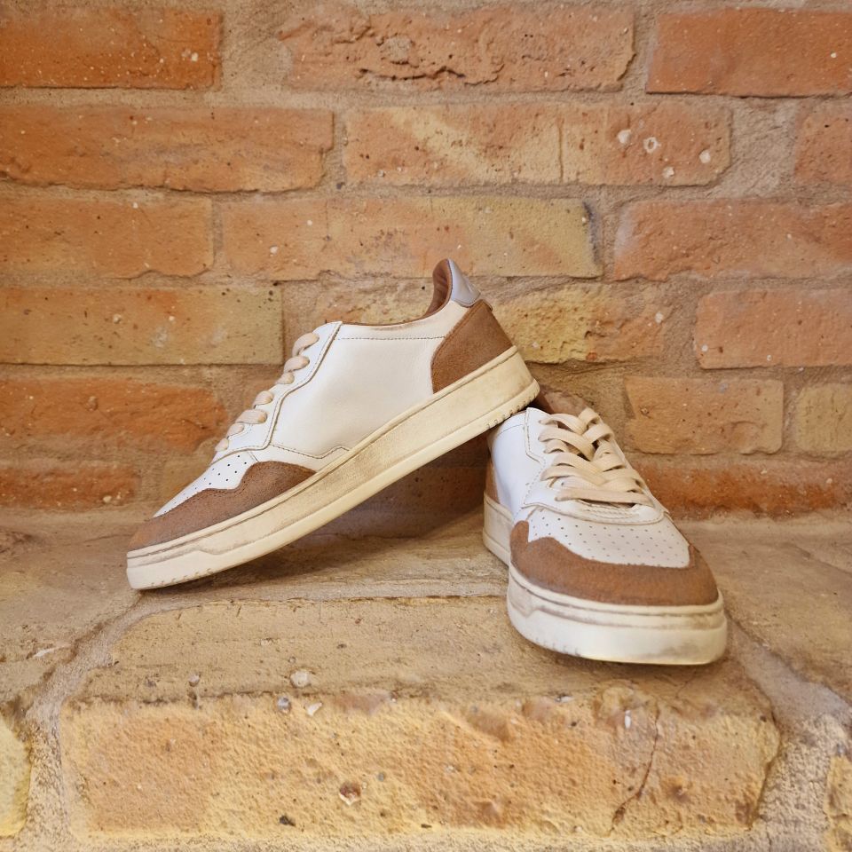 Sneakers in pelle di vitello bianca con inserti in suede in un ricercato mix di tonalità cognac e grigio.