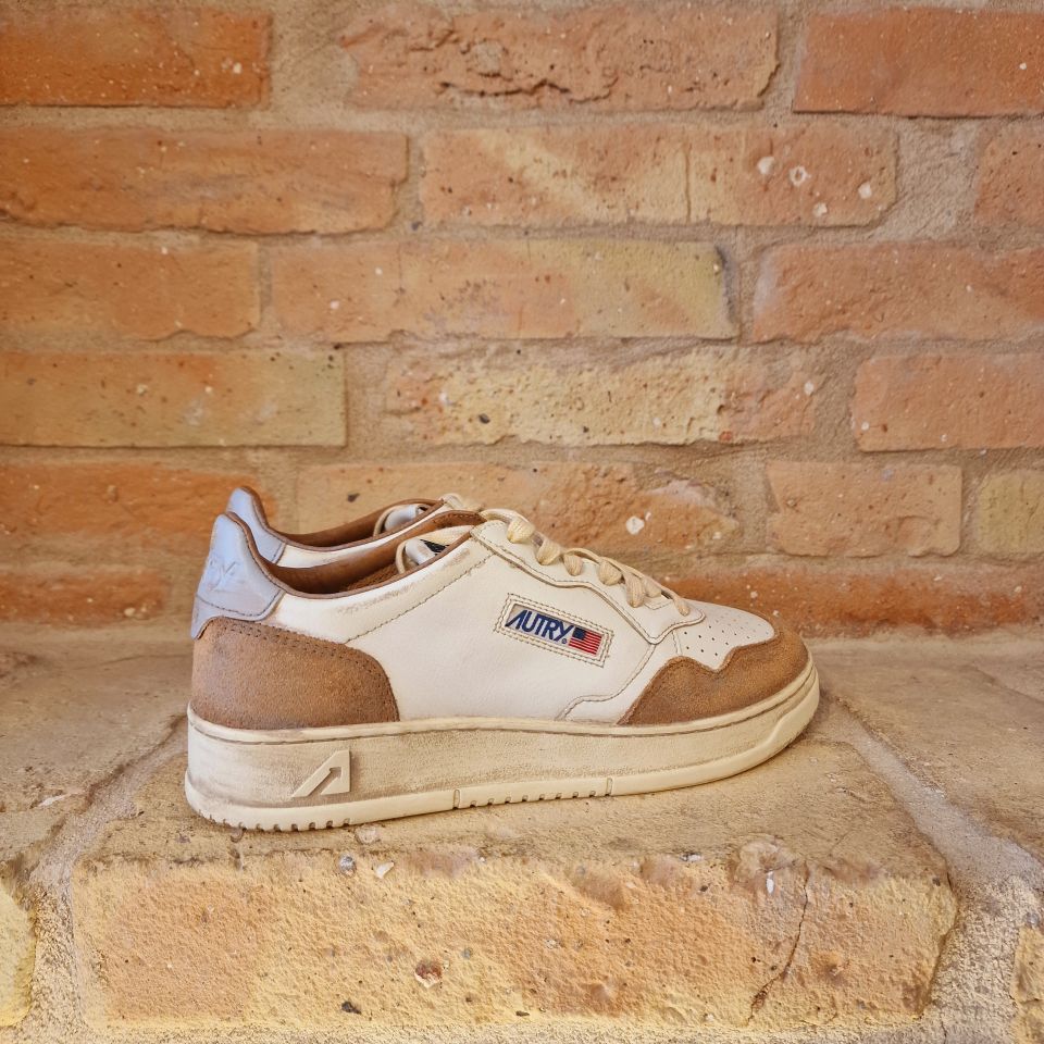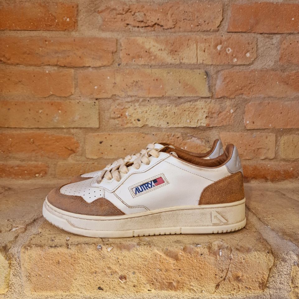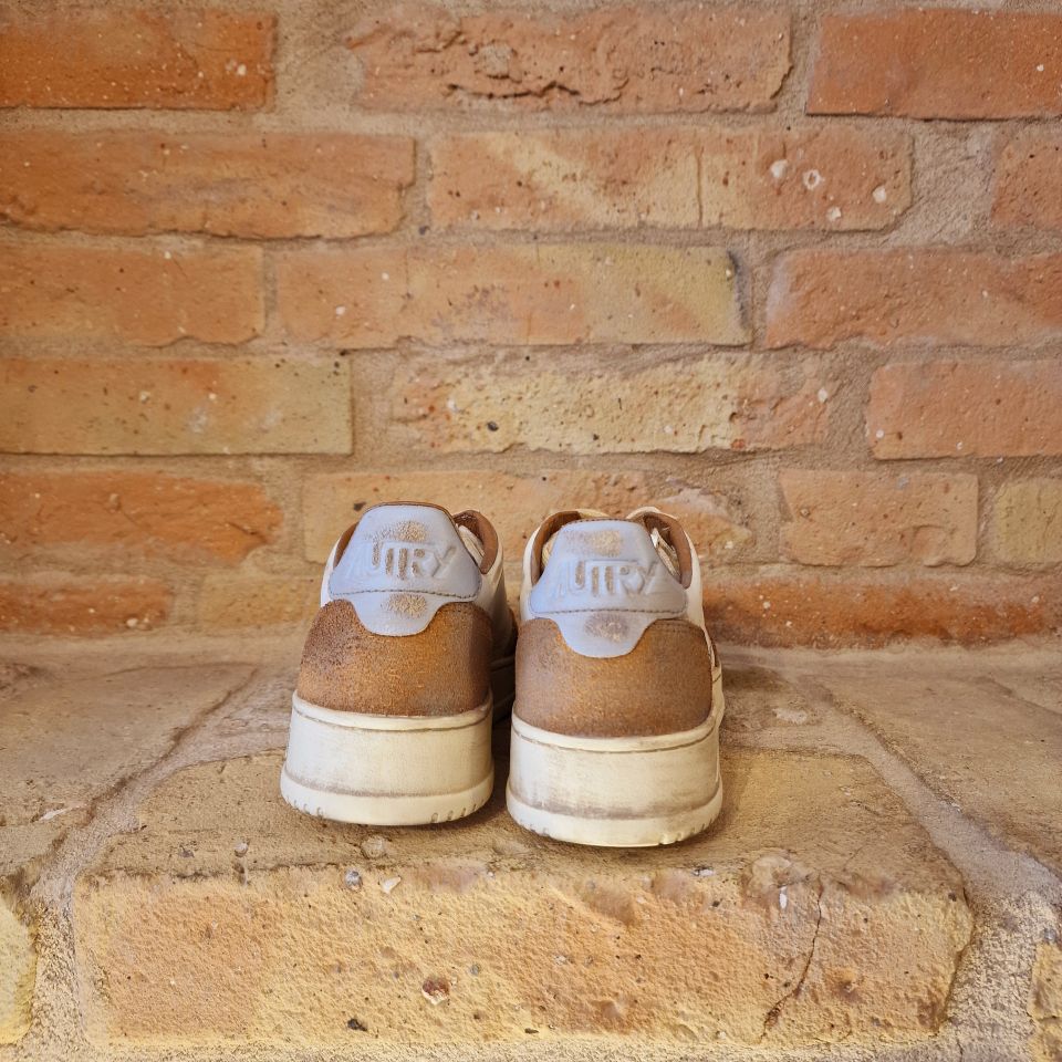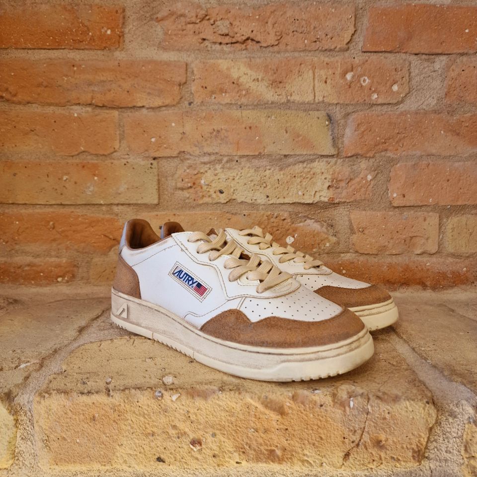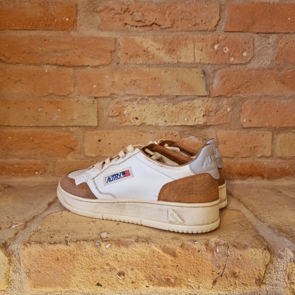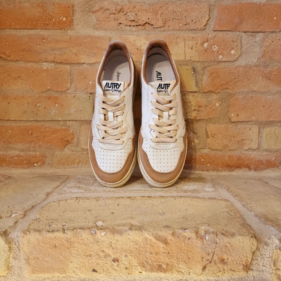 Sneakers in pelle di vitello bianca con inserti in suede in un ricercato mix di tonalità cognac e grigio.