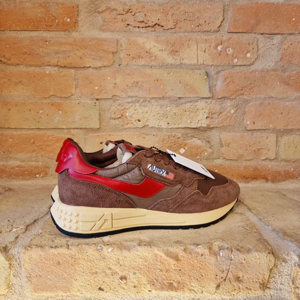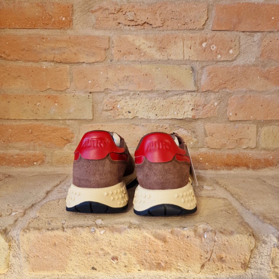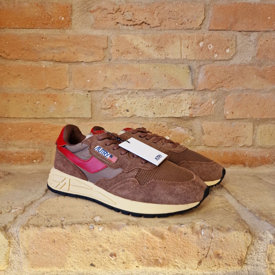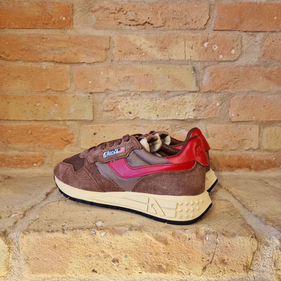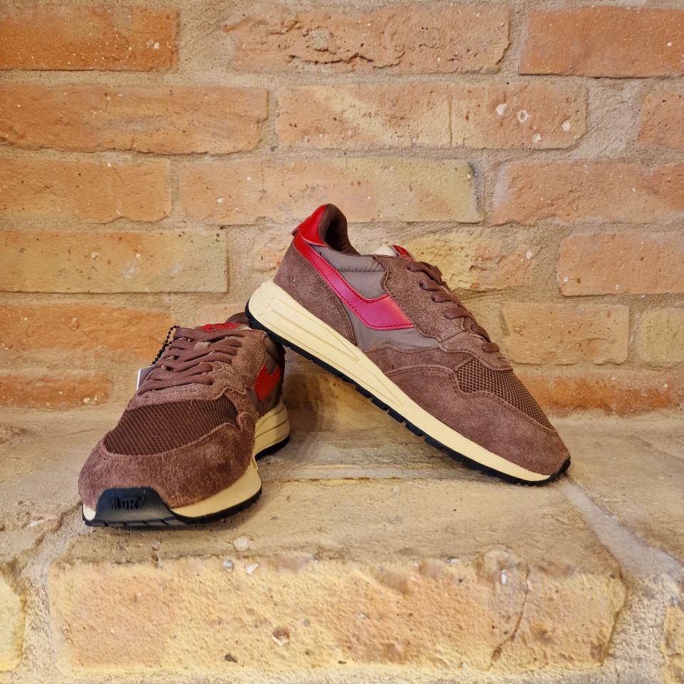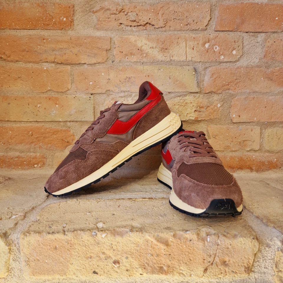 Un mix di nylon e suede marrone con logo sui lati in pelle rossa.