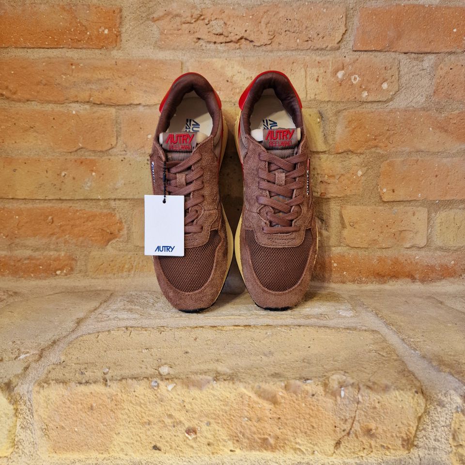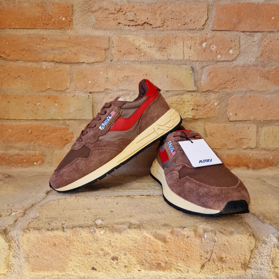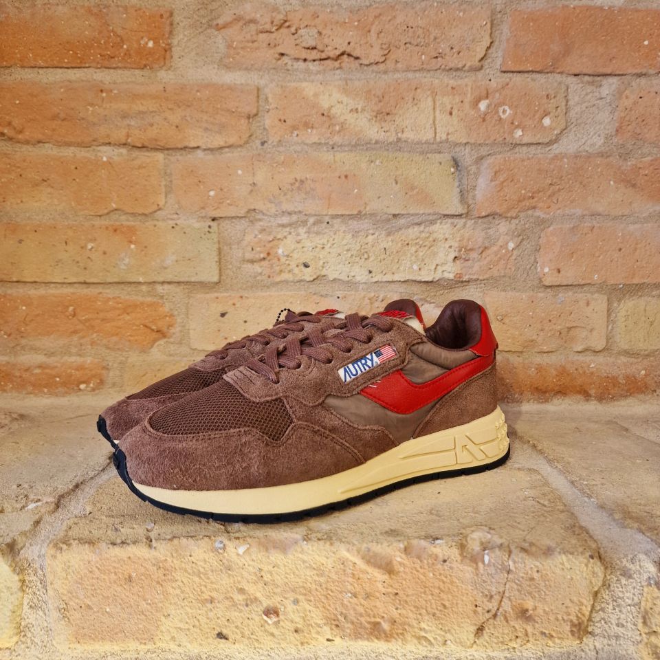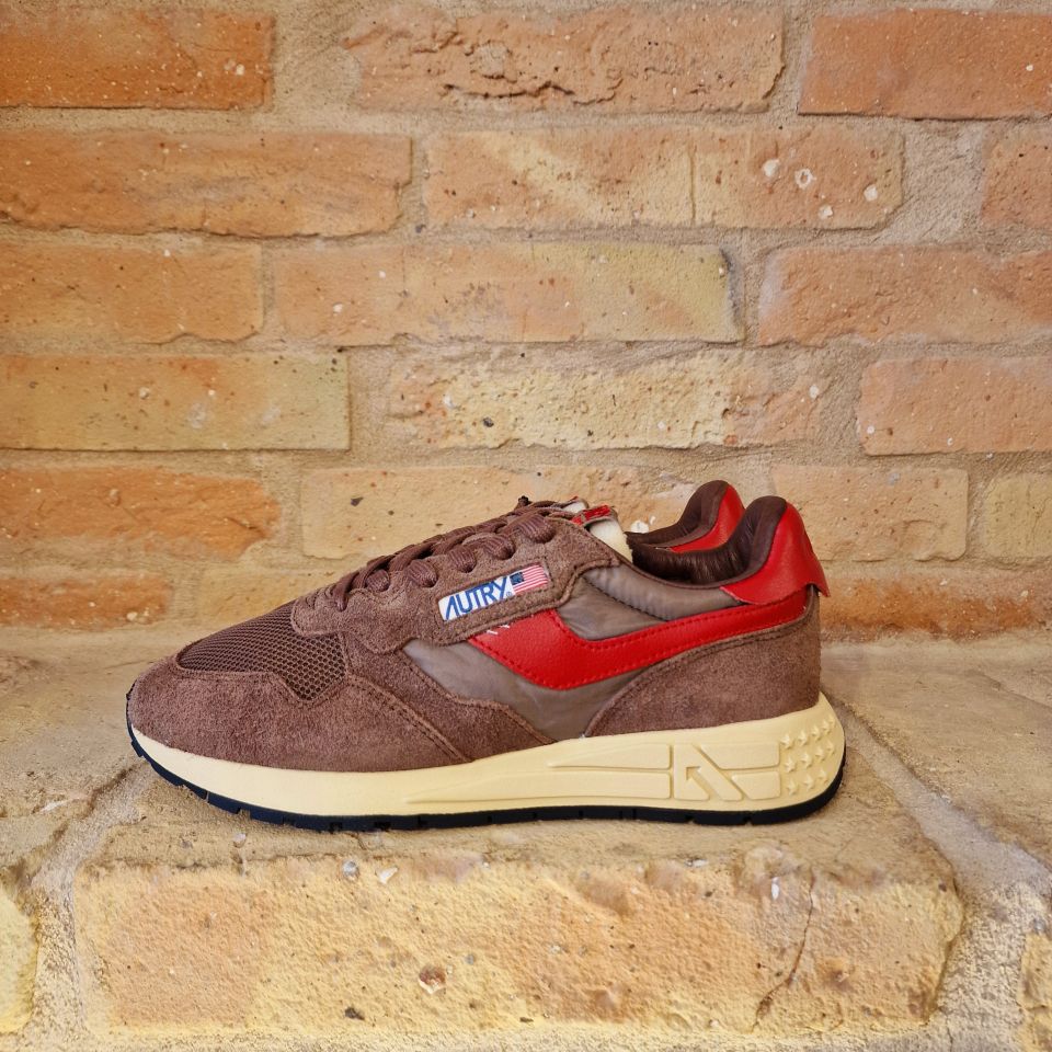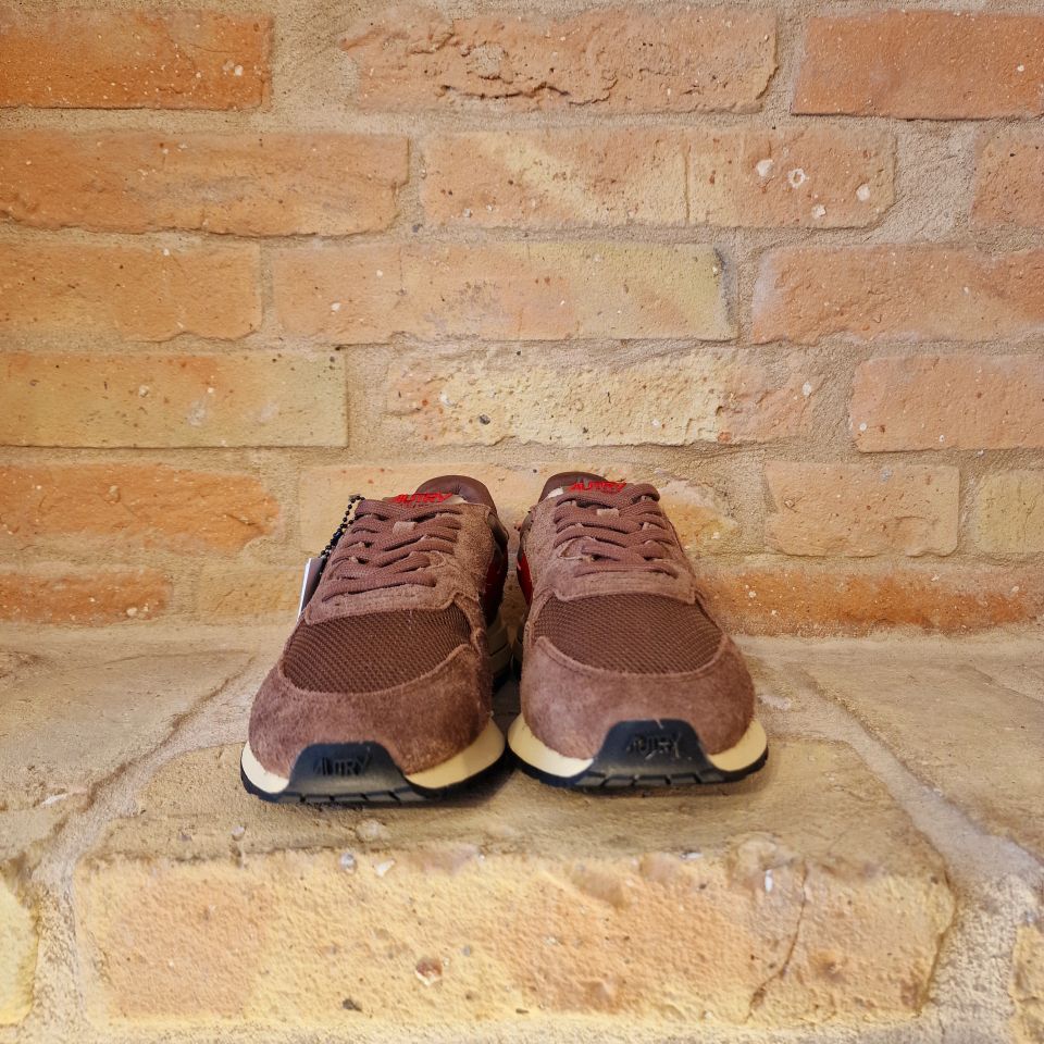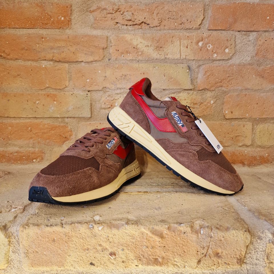 Un mix di nylon e suede marrone con logo sui lati in pelle rossa.