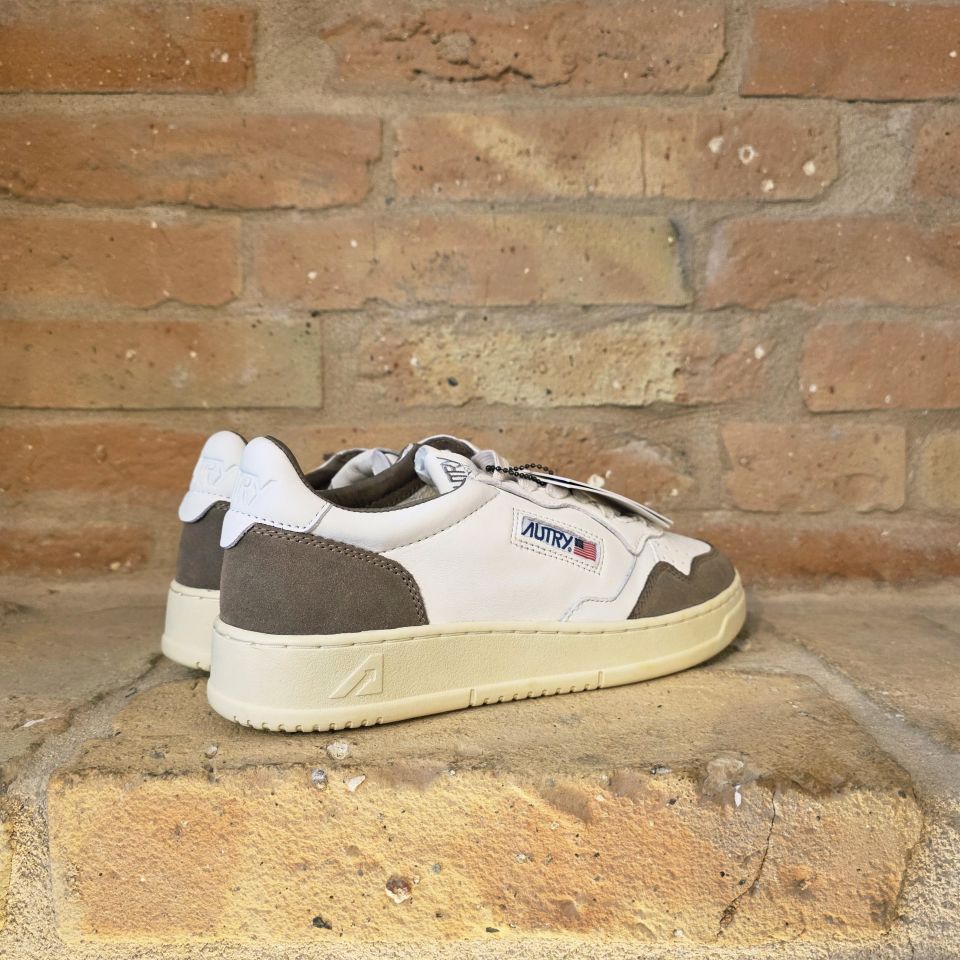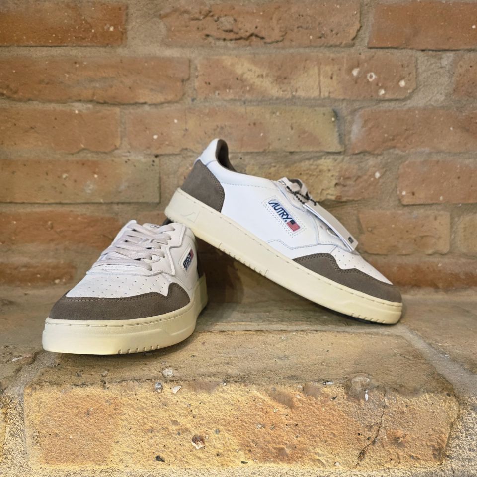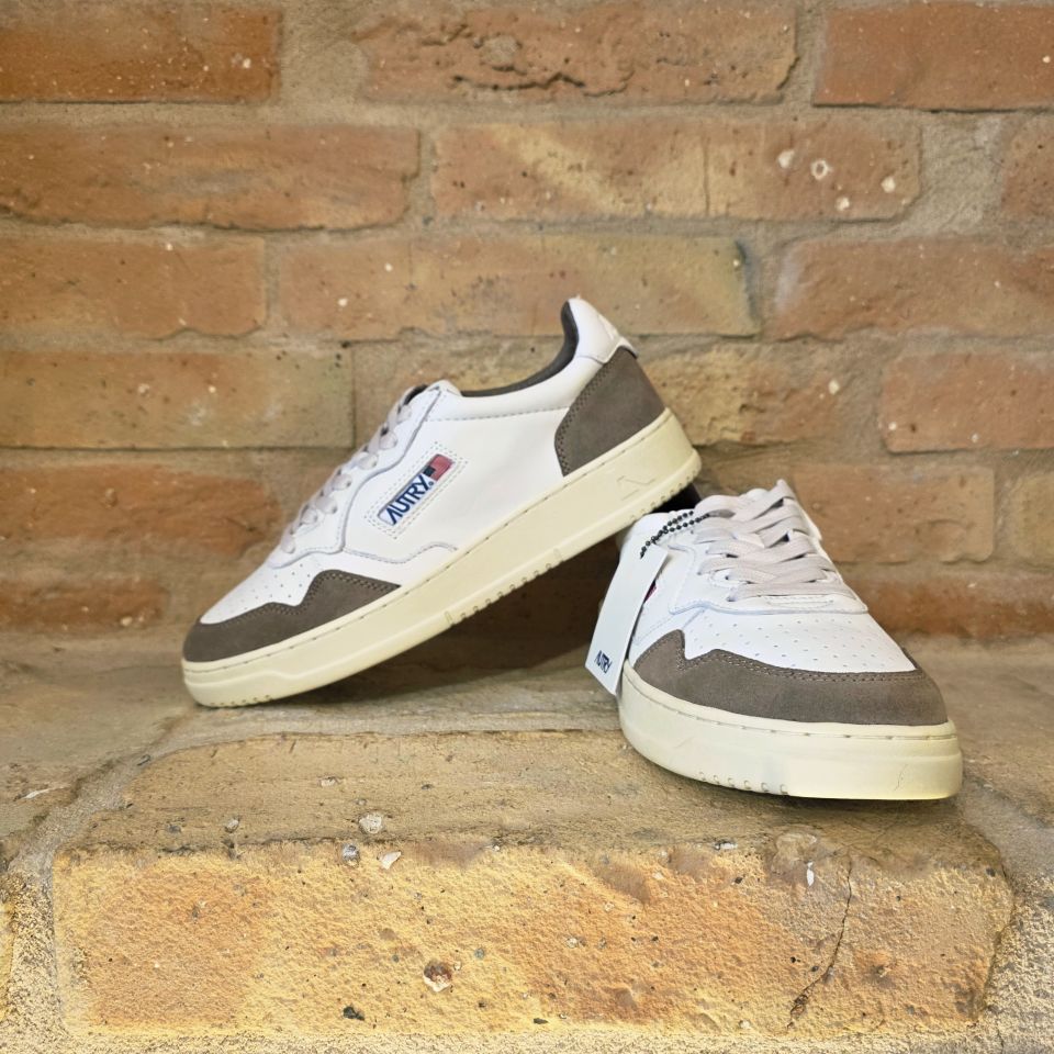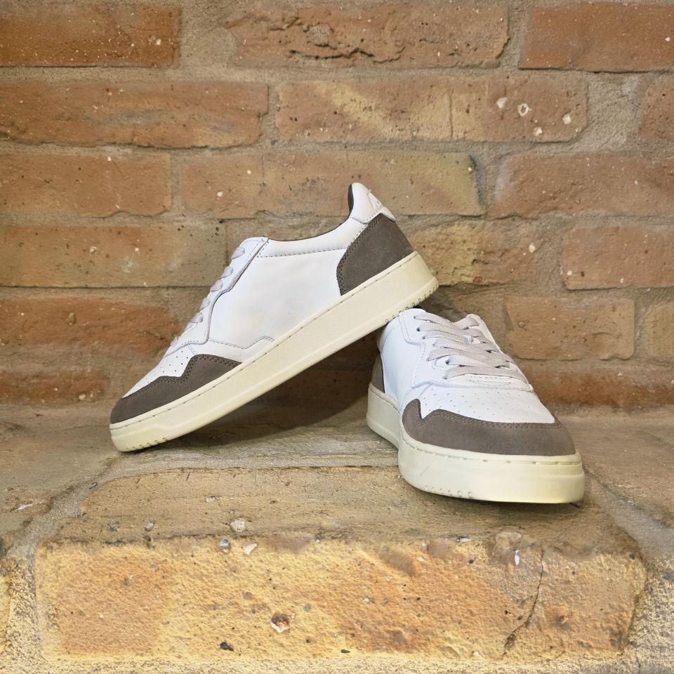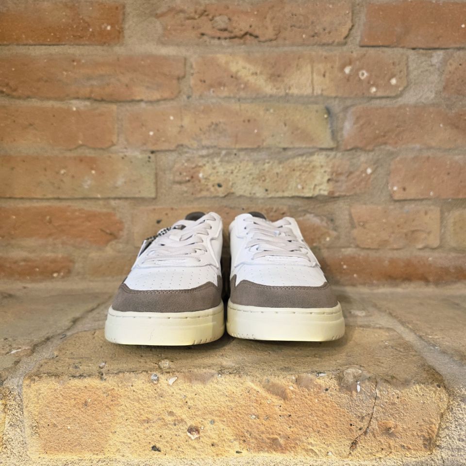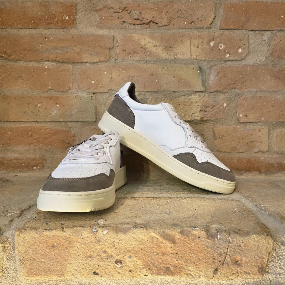 Sneakers in pelle di capra bianca con dettagli in suede tabacco.