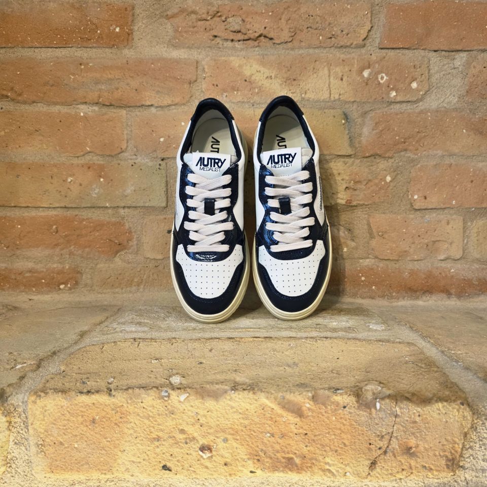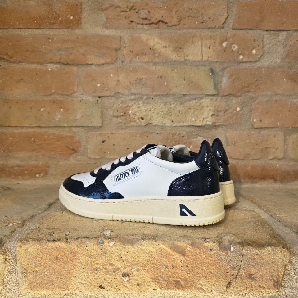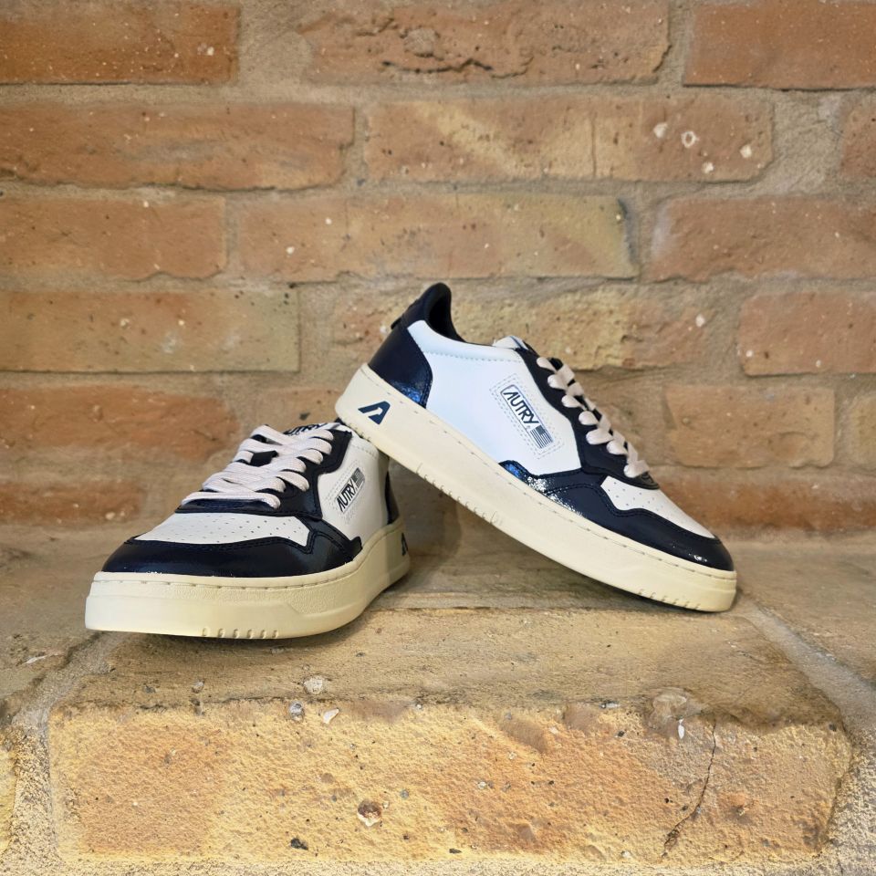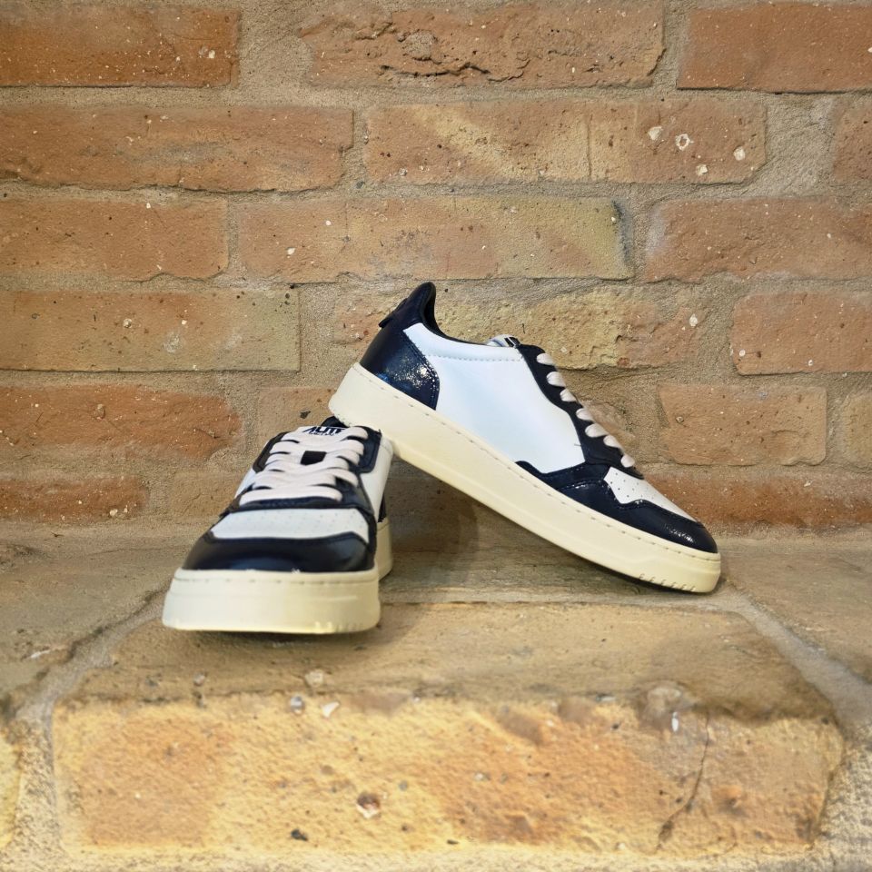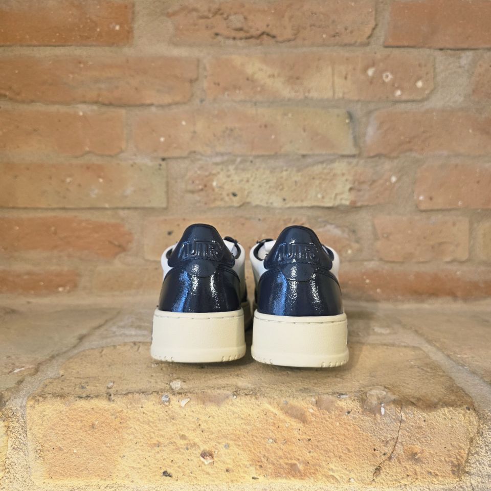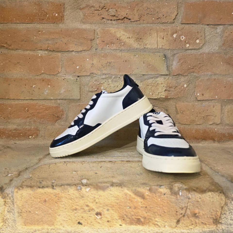 Sneakers in pelle di vitello bianca con inserti in vernice blu.