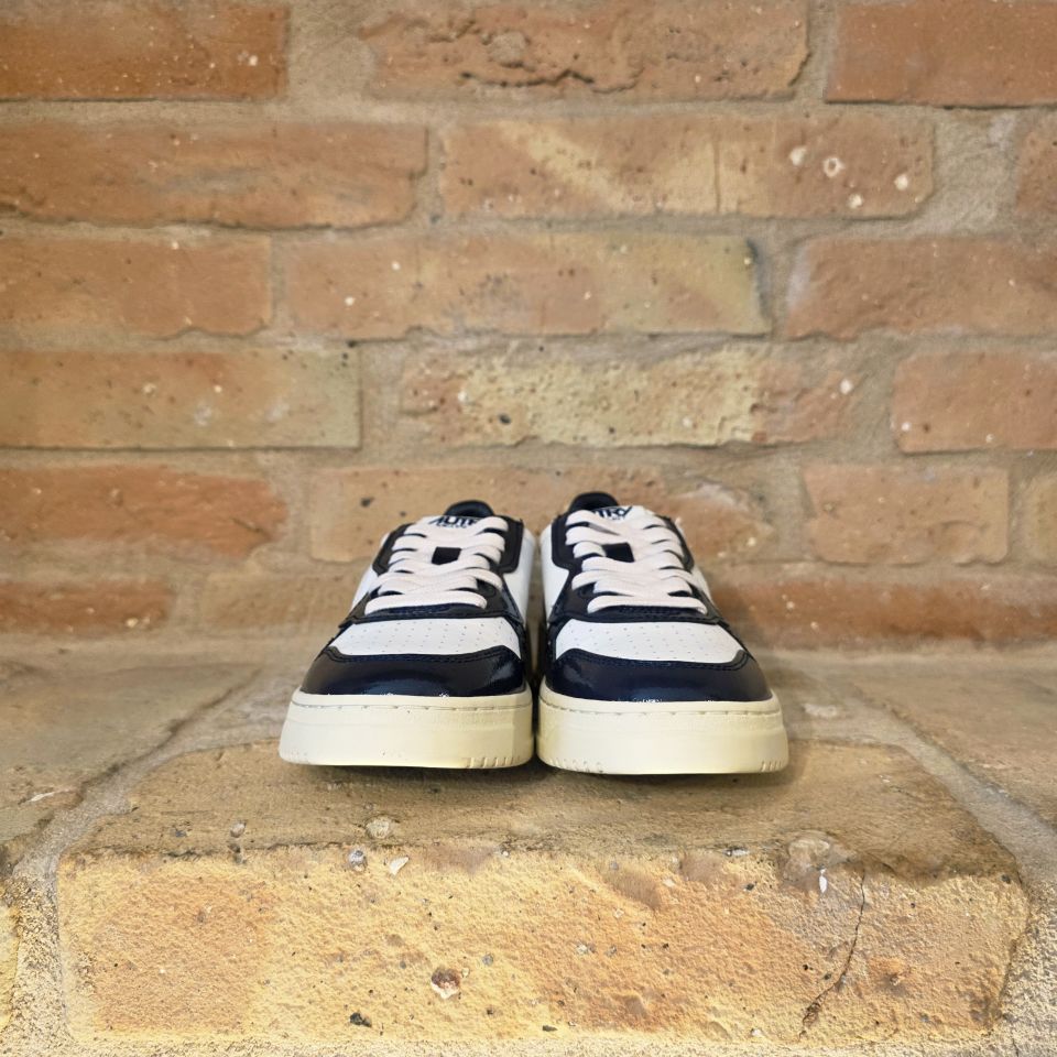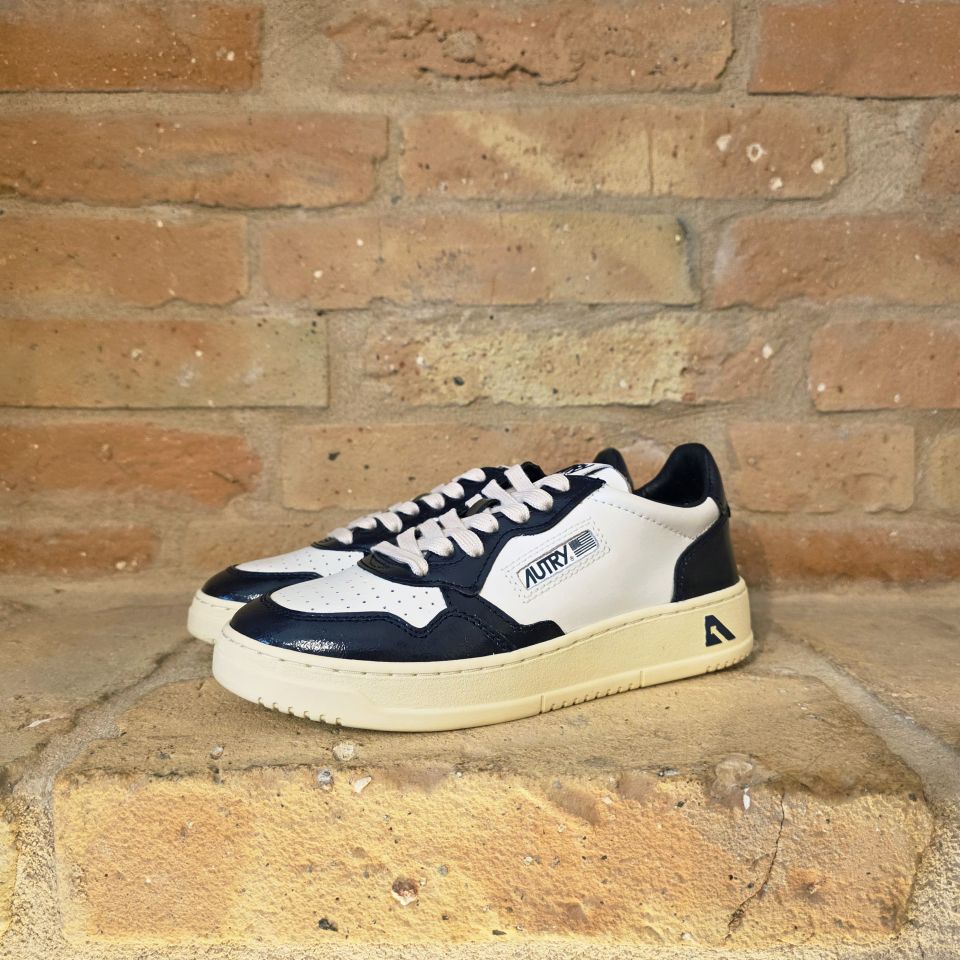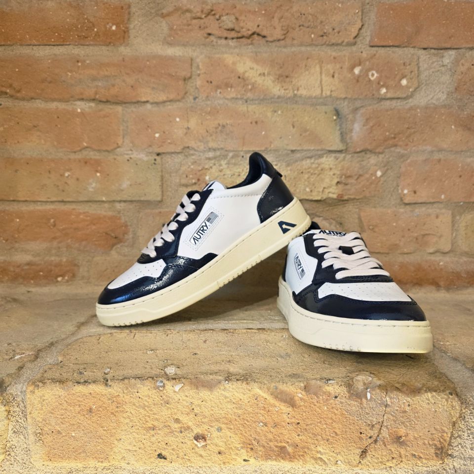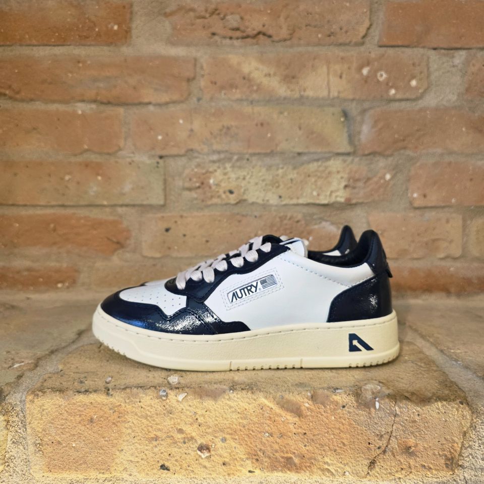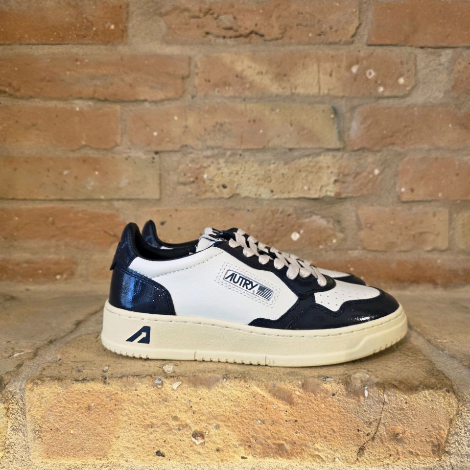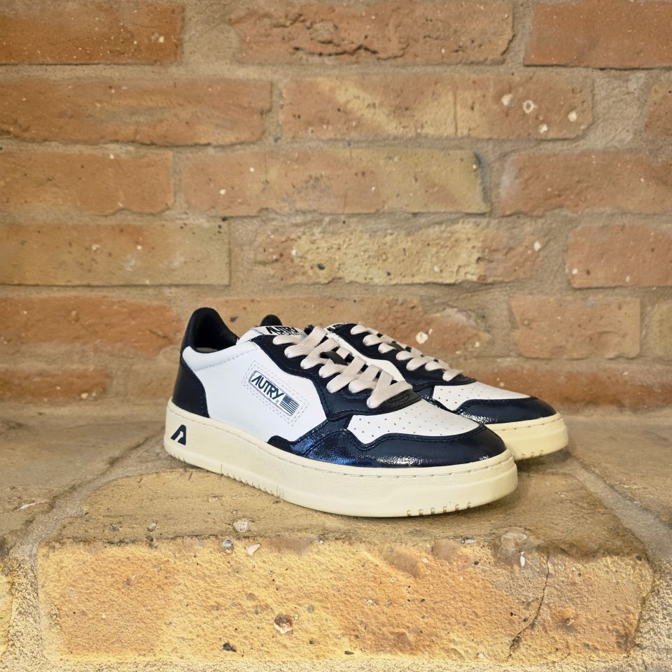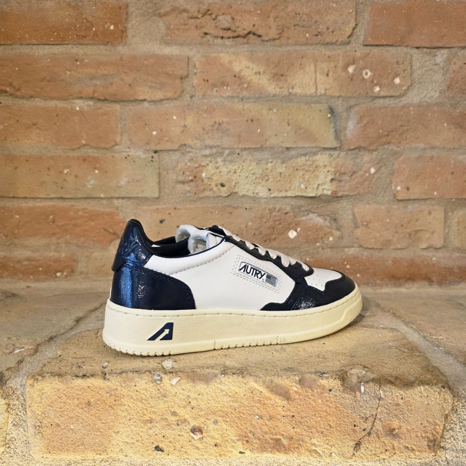 Sneakers in pelle di vitello bianca con inserti in vernice blu.