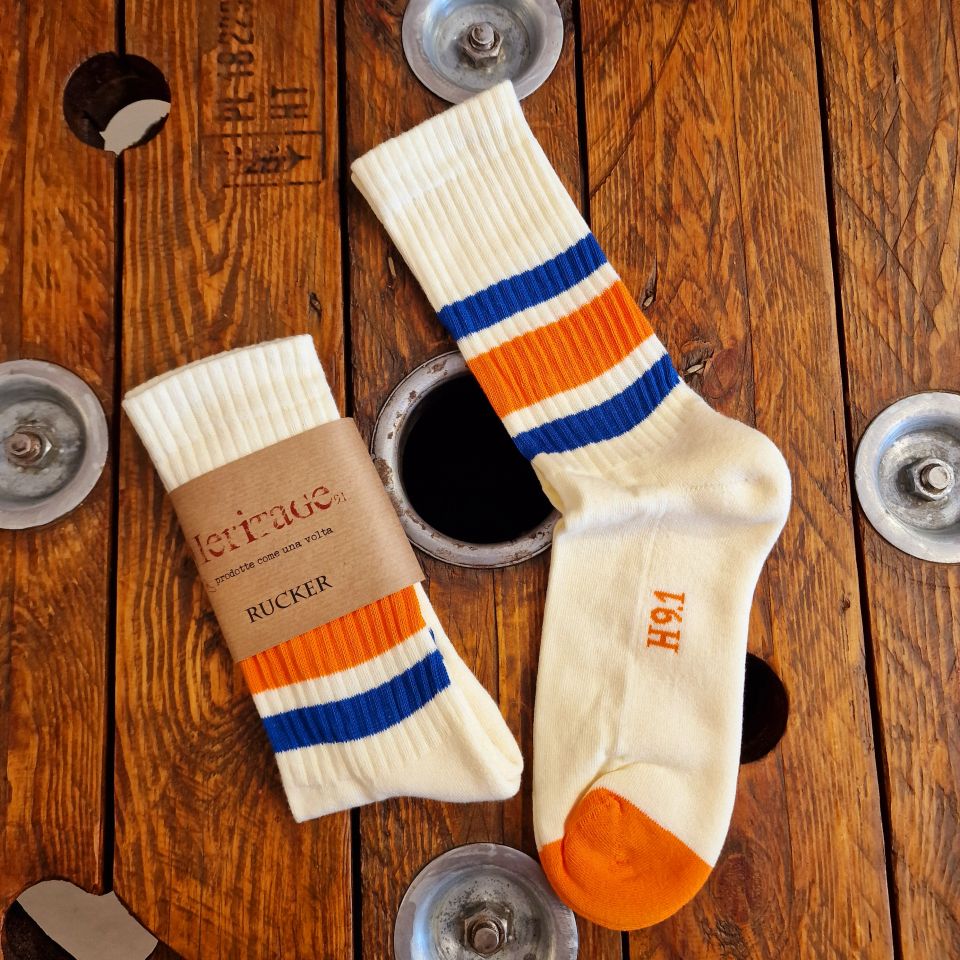 Calzini modello Rucker color panna con strisce cobalto e arancio.