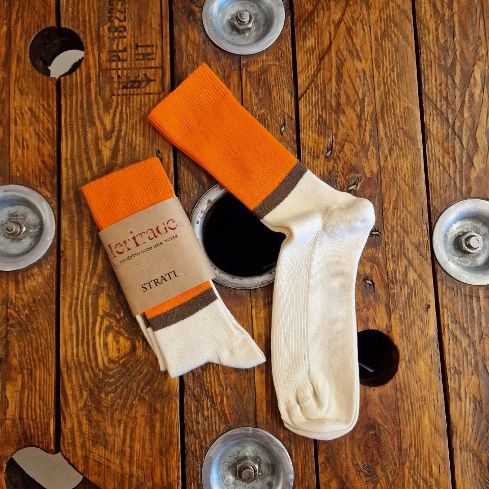 Calzini modello Strati colore arancio e panna con striscia marrone.