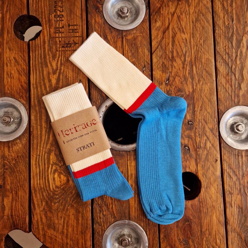 Calzini modello Strati colore bianco e azzurro con striscia rossa.