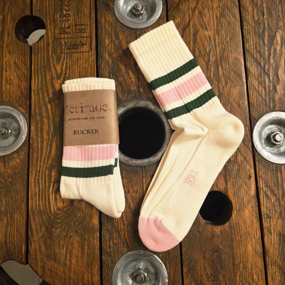 Calzini modello Rucker color panna con strisce verdi e rosa.