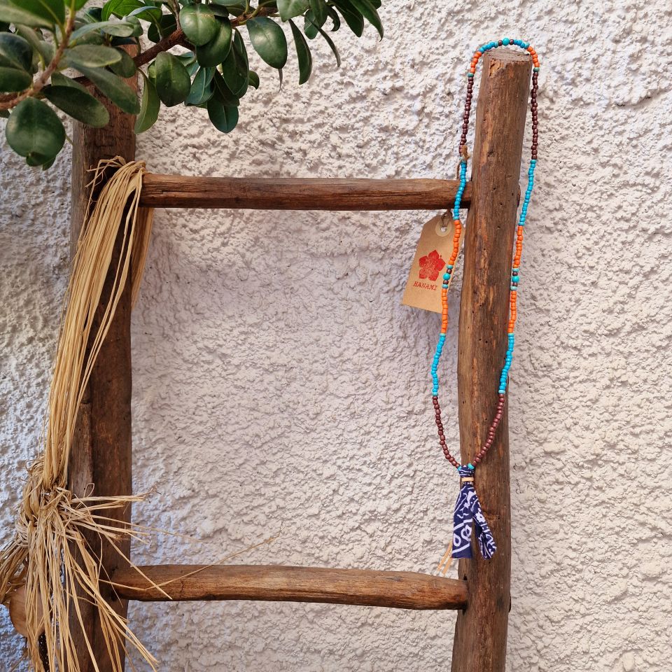 Pendente in cotone Blu stampa bandana e laccetto Cuoio.