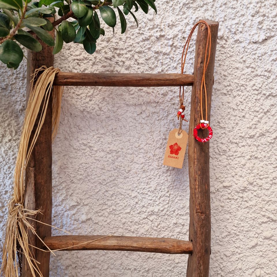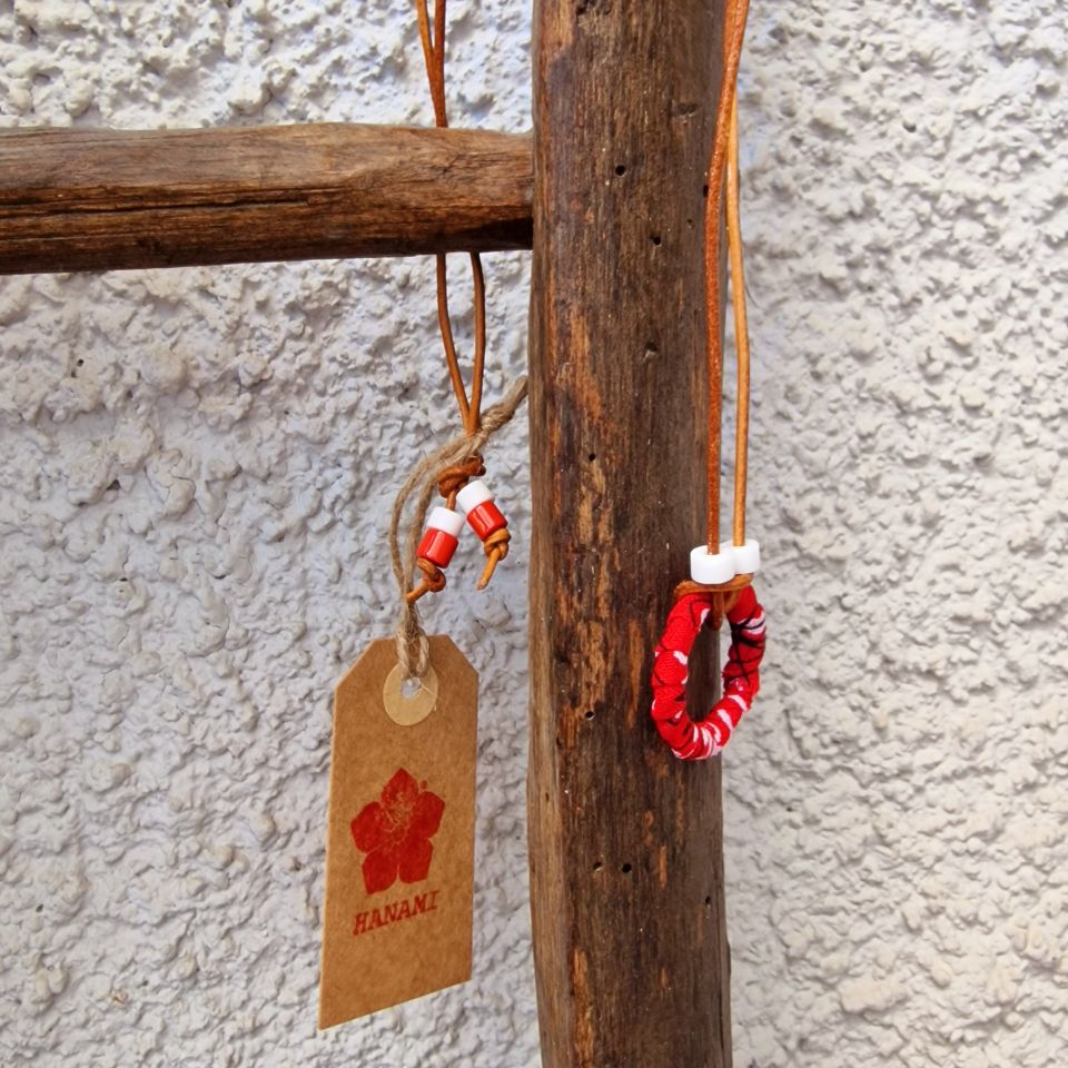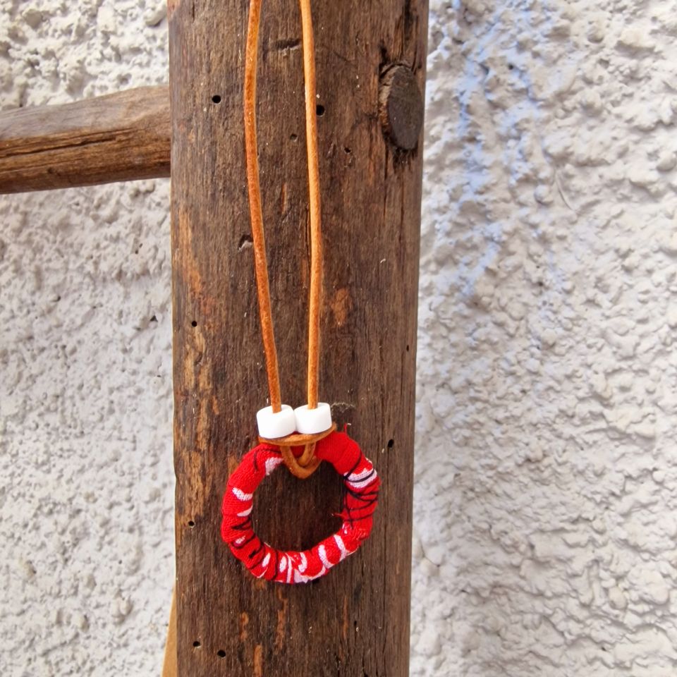 Collana in cuoio marrone con anello Rosso stampa bandana Portaocchiali e perline Bianche.