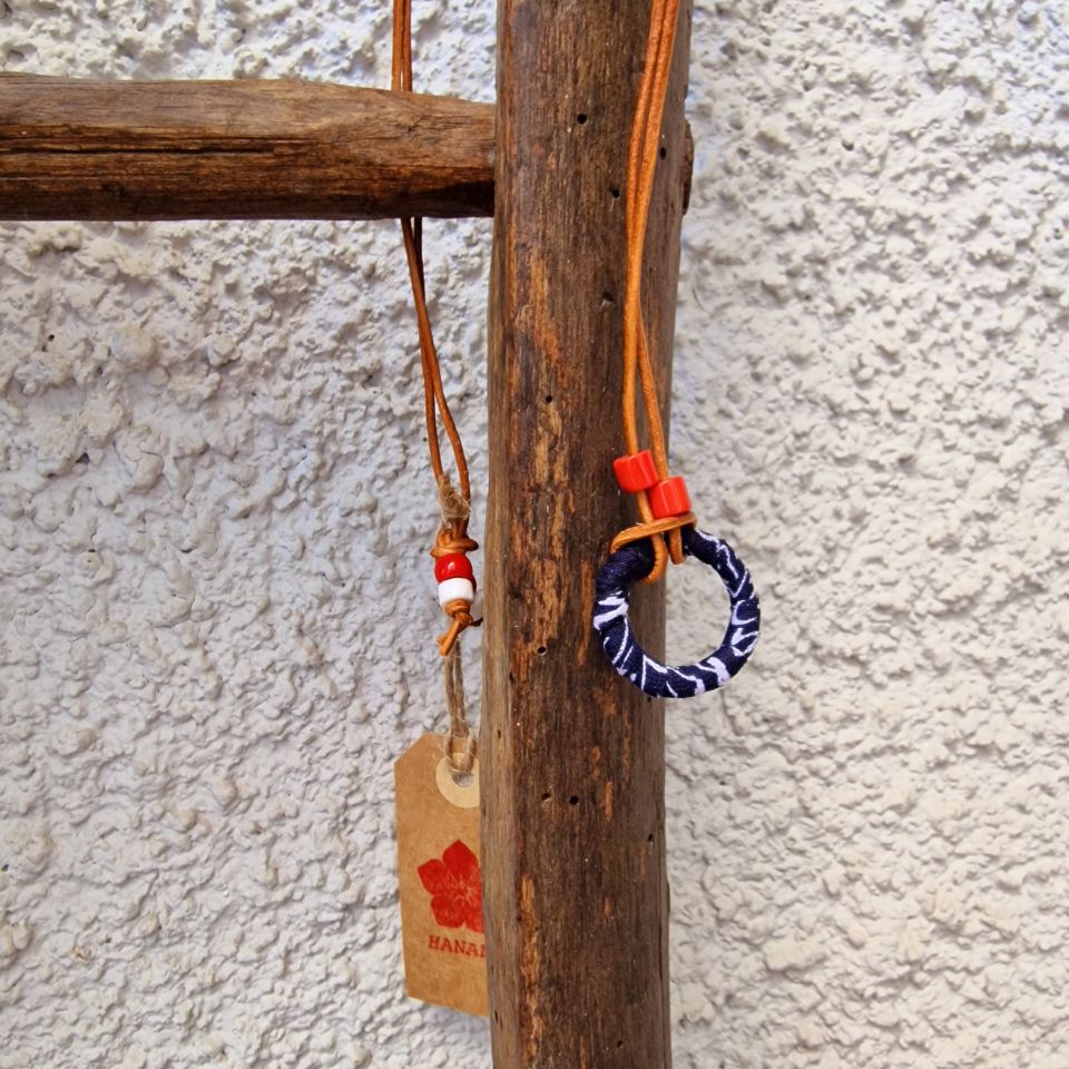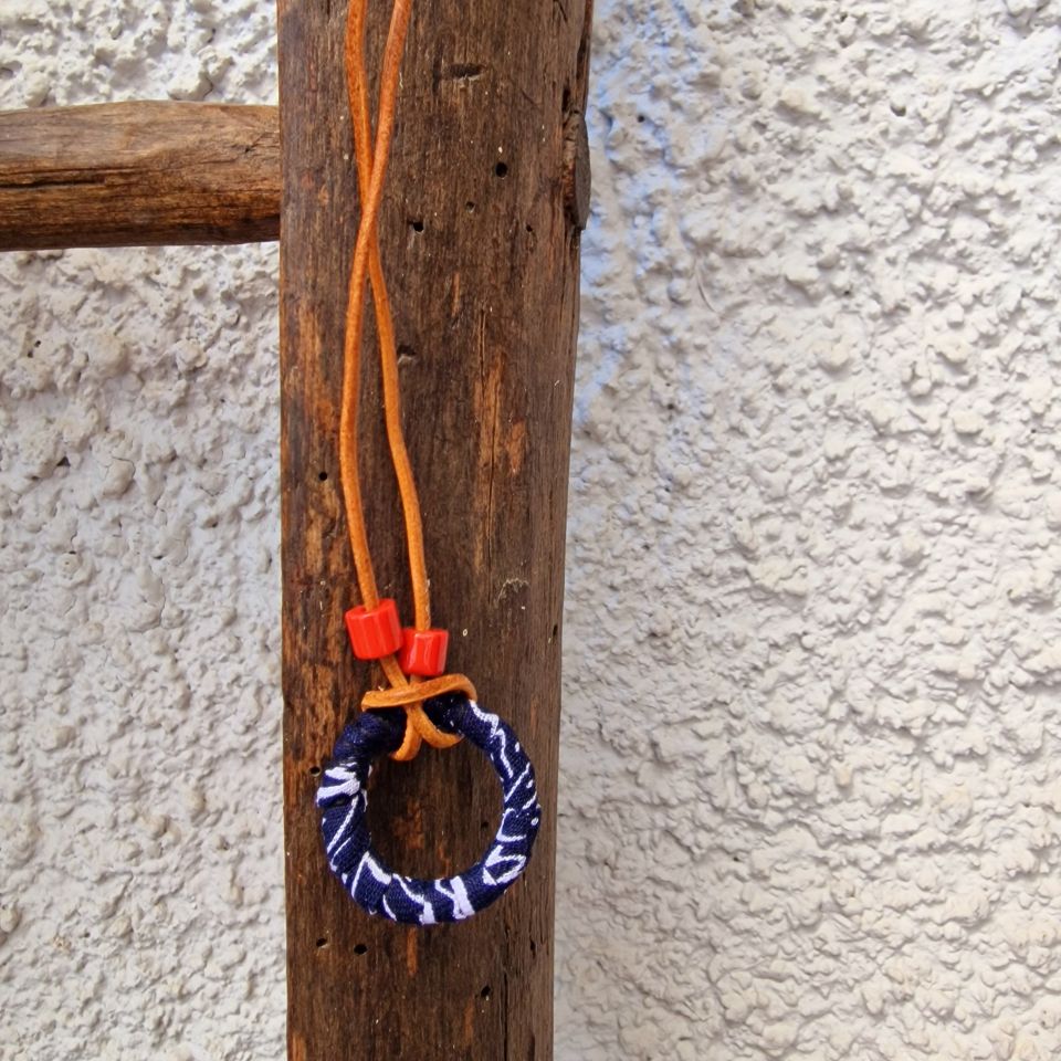 Collana in cuoio marrone con anello Blu stampa bandana Portaocchiali e perline Rosse.