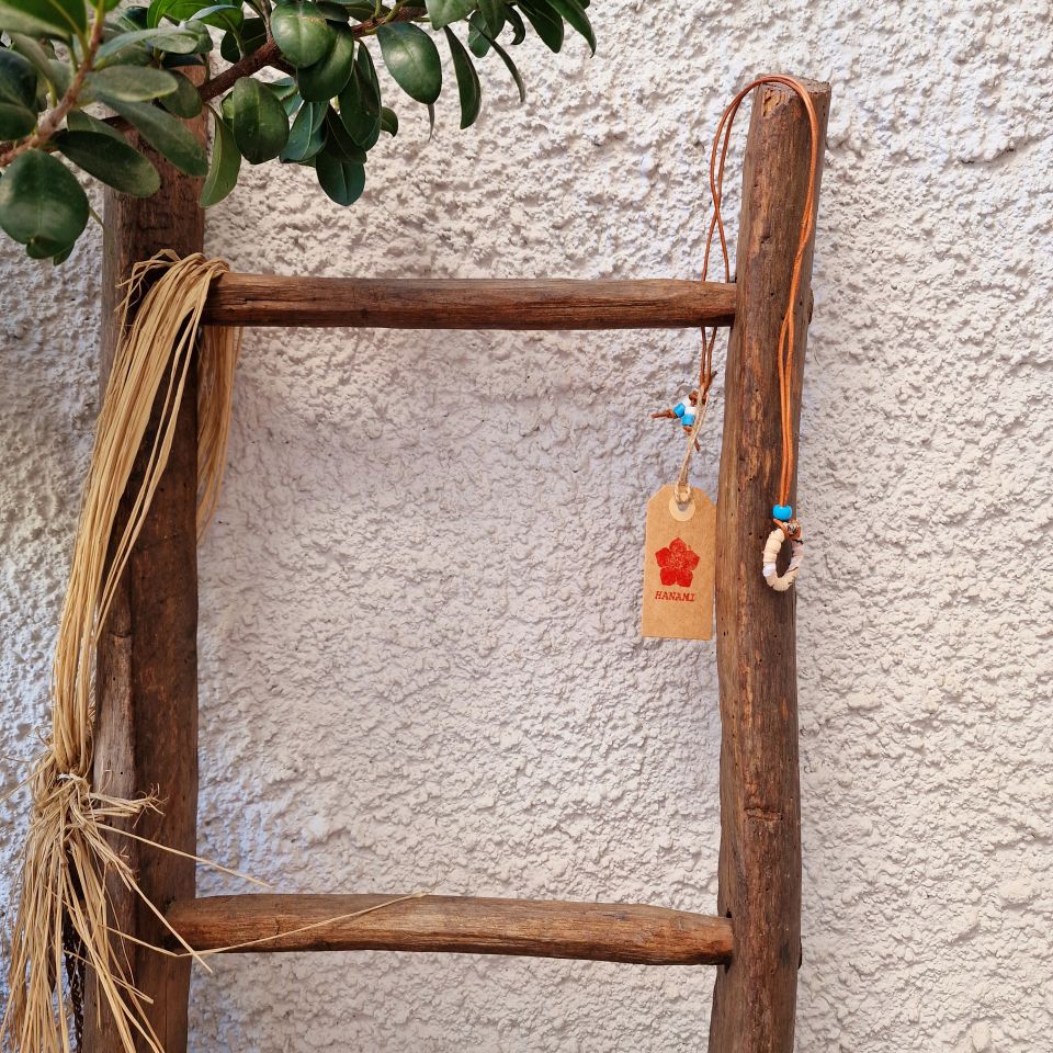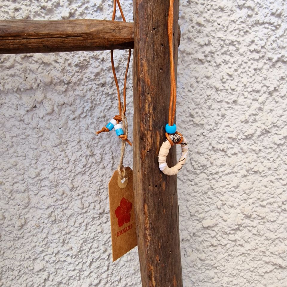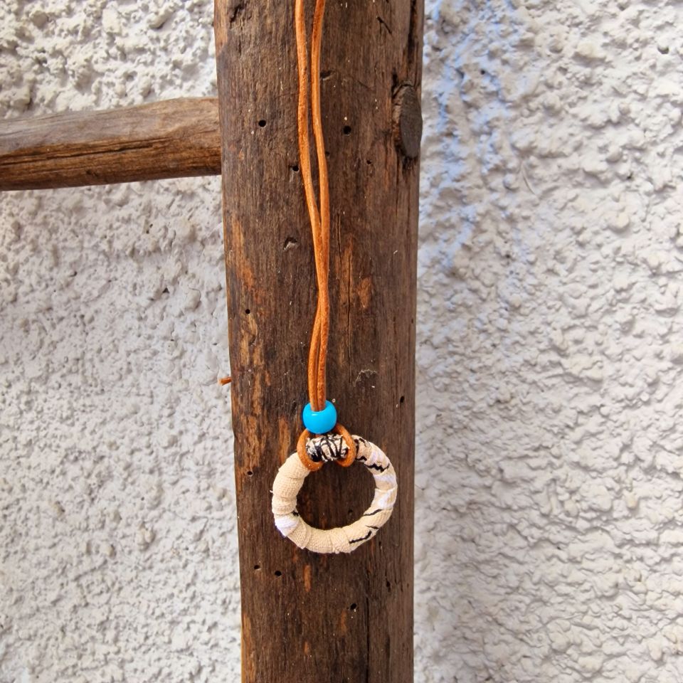 Collana in cuoio marrone con anello Beige stampa bandana Portaocchiali e perline Turchese.