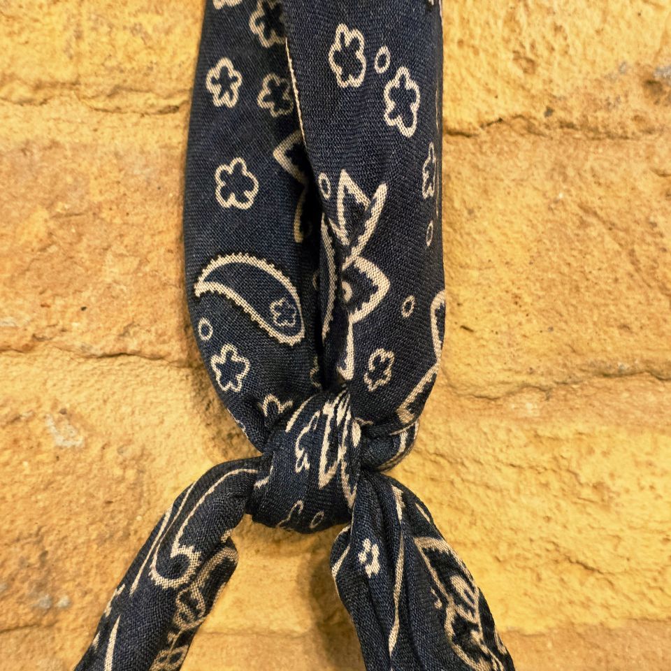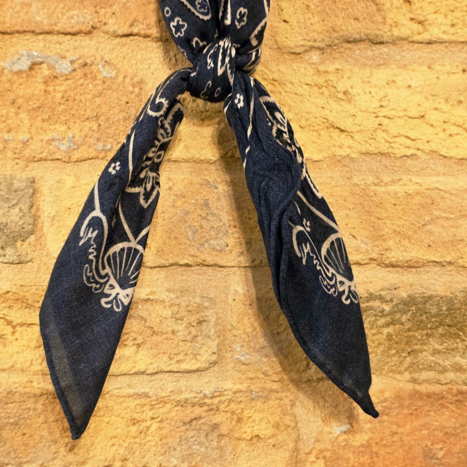 Bandana fondo blu con dettagli bianchi.