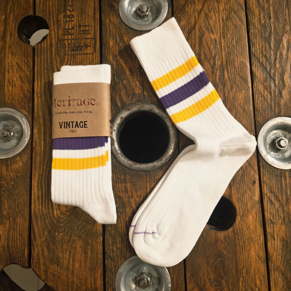 Calzini modello Vintage 1980 color panna con strisce giallo e viola.