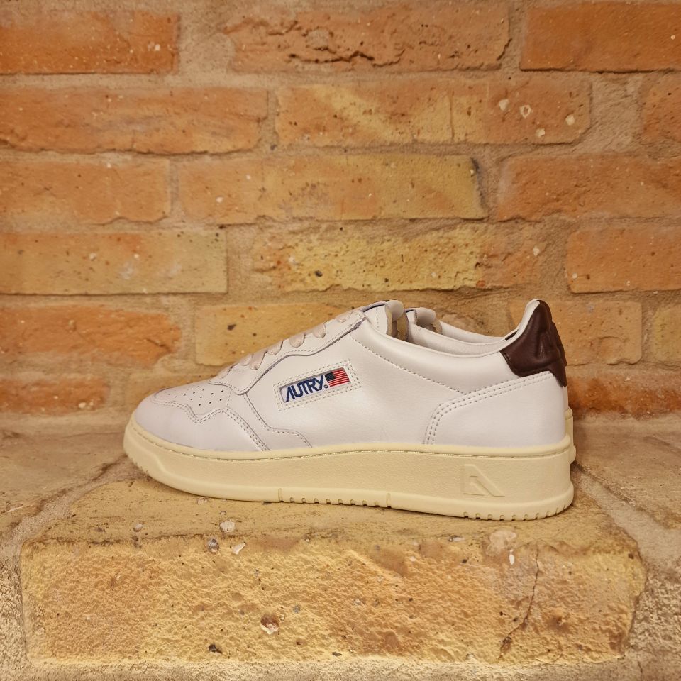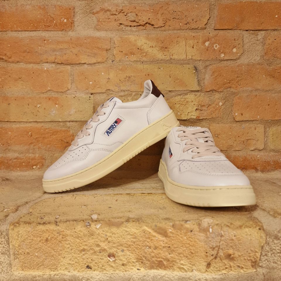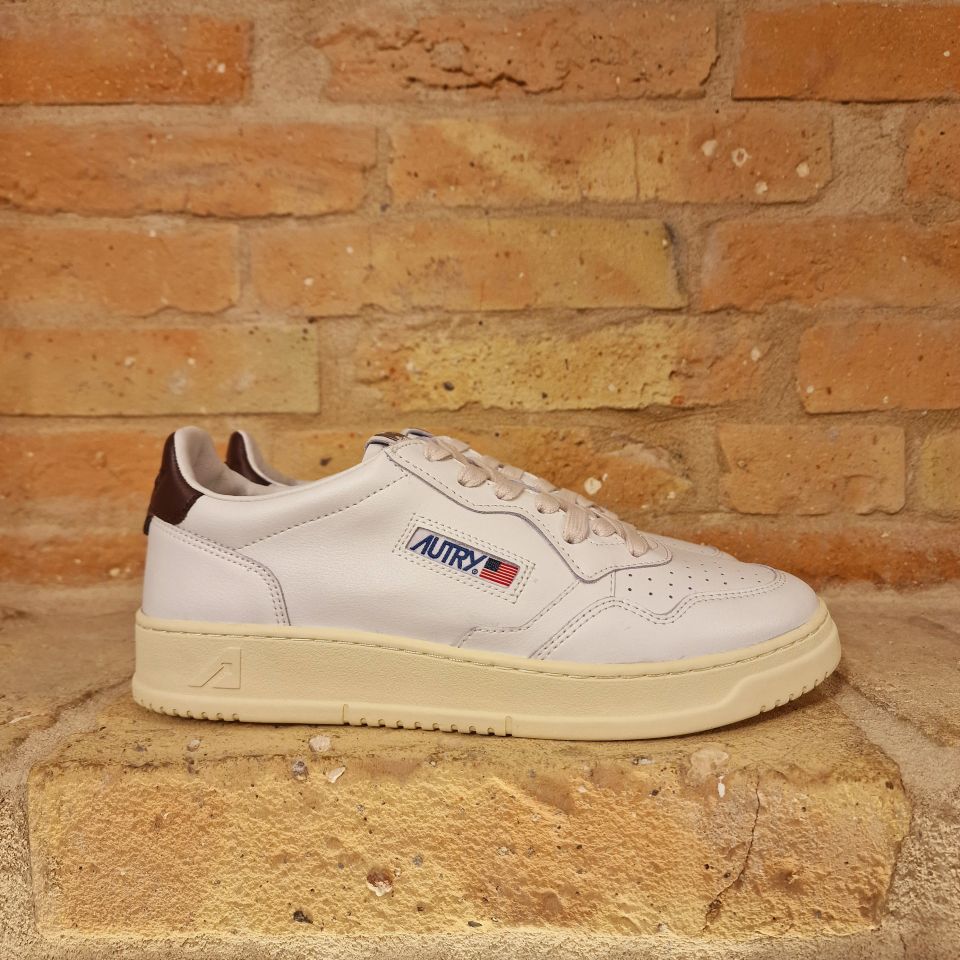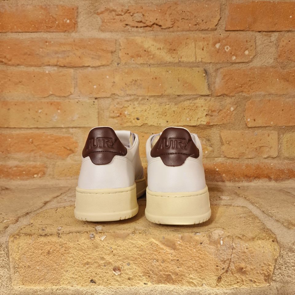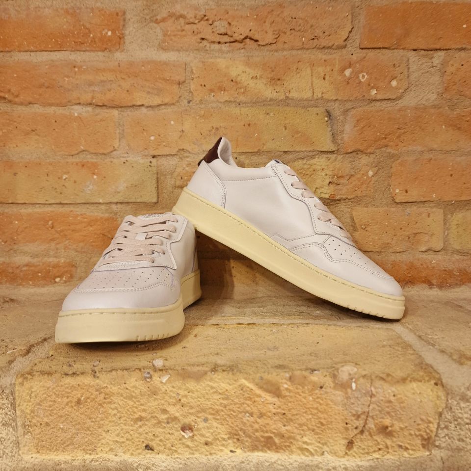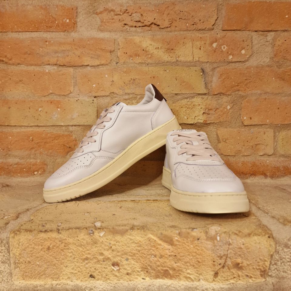 Sneakers in pelle di vitello bianca e tallone marrone.