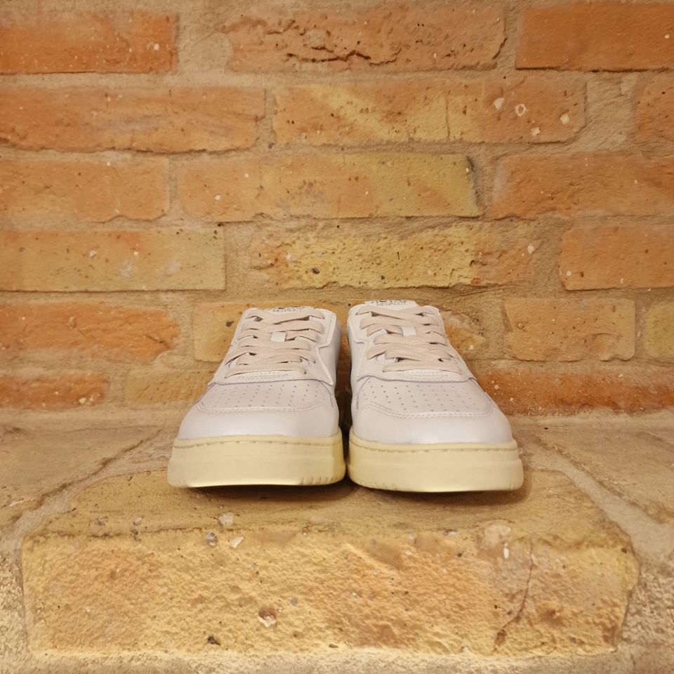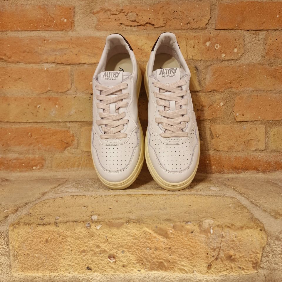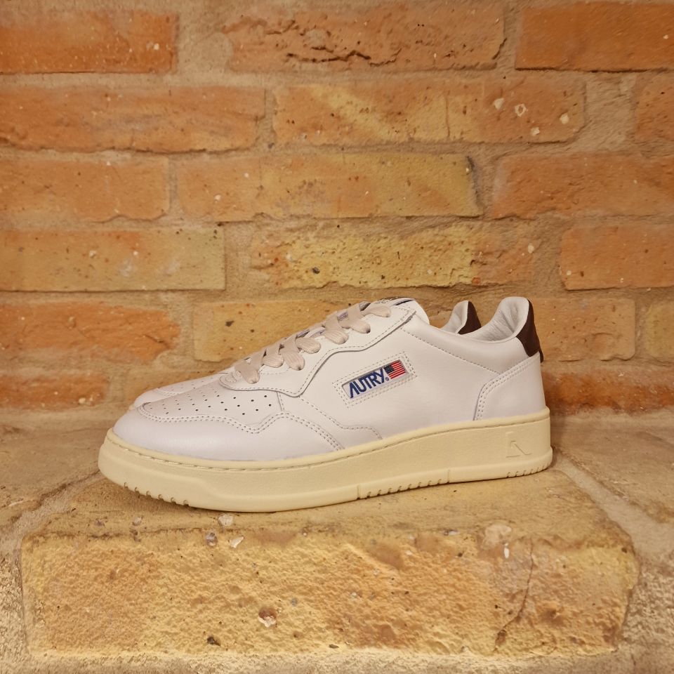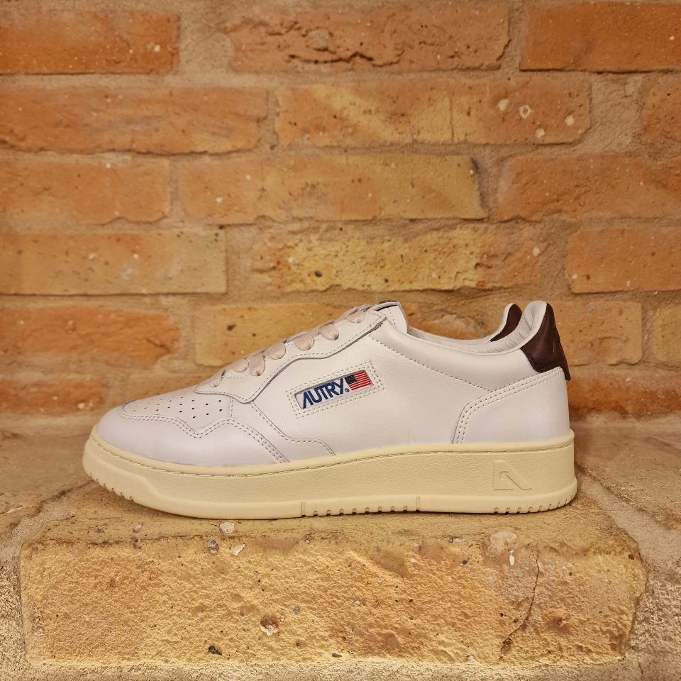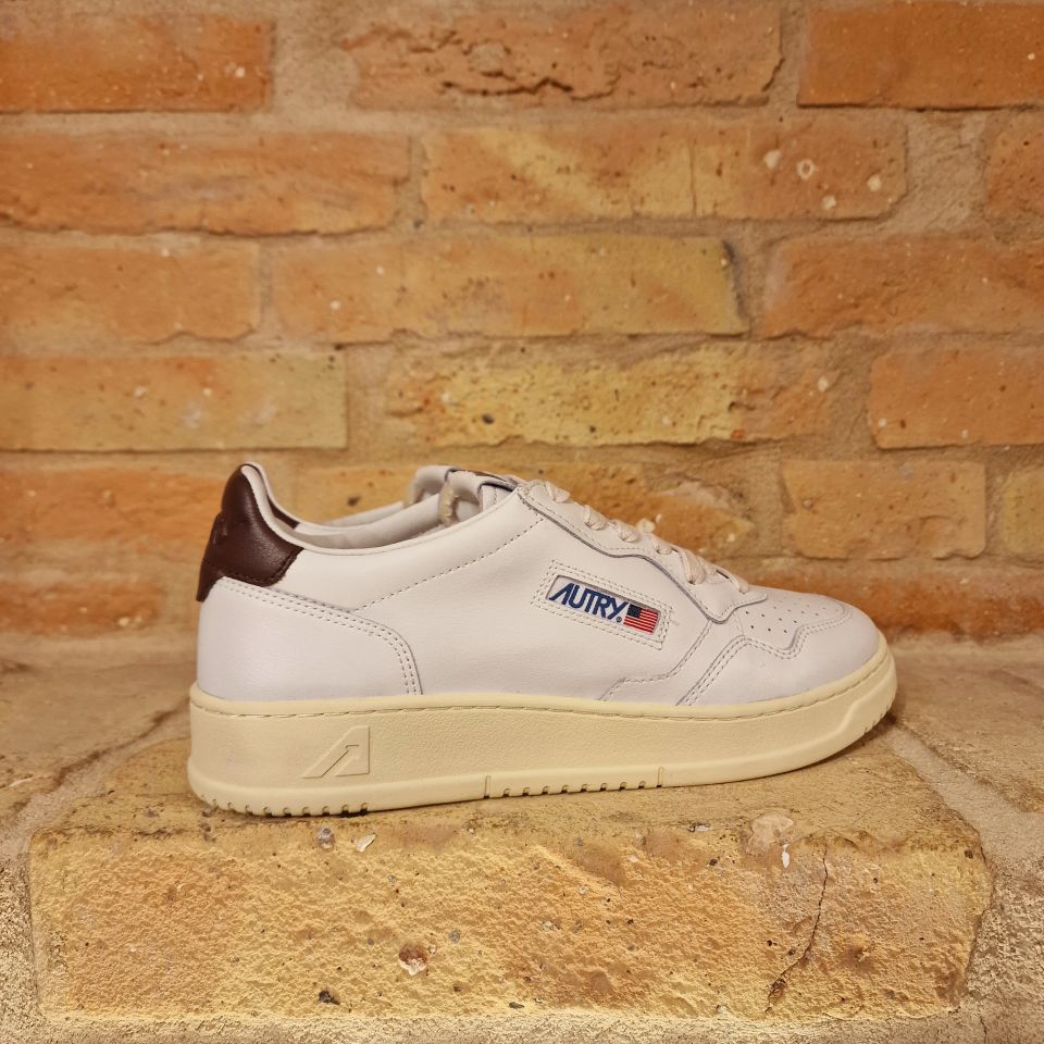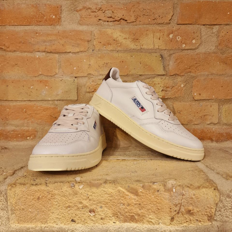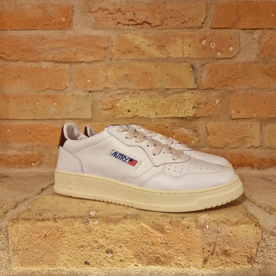 Sneakers in pelle di vitello bianca e tallone marrone.
