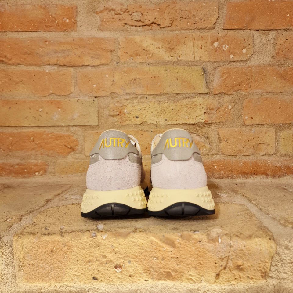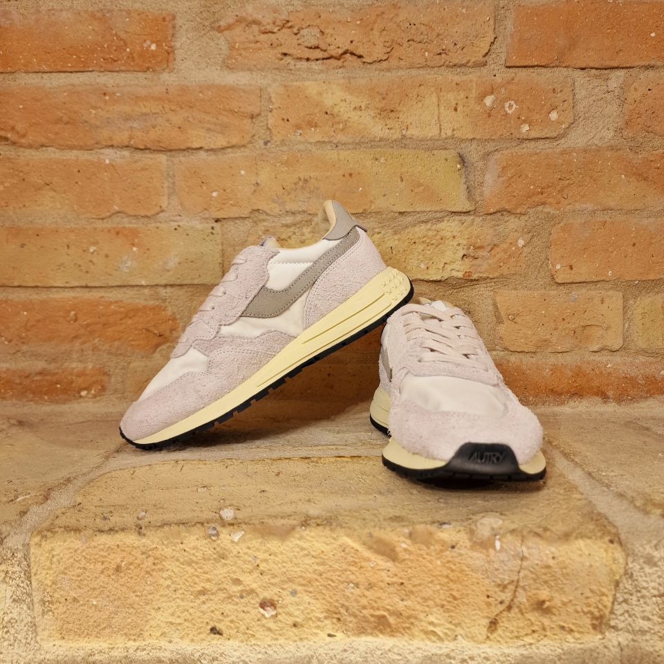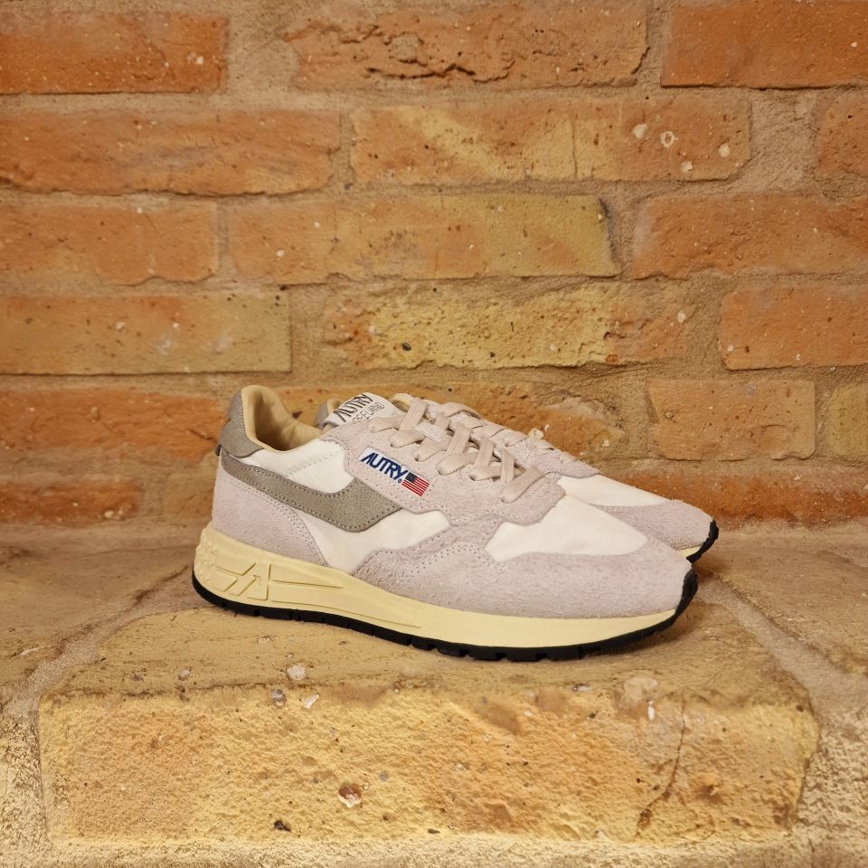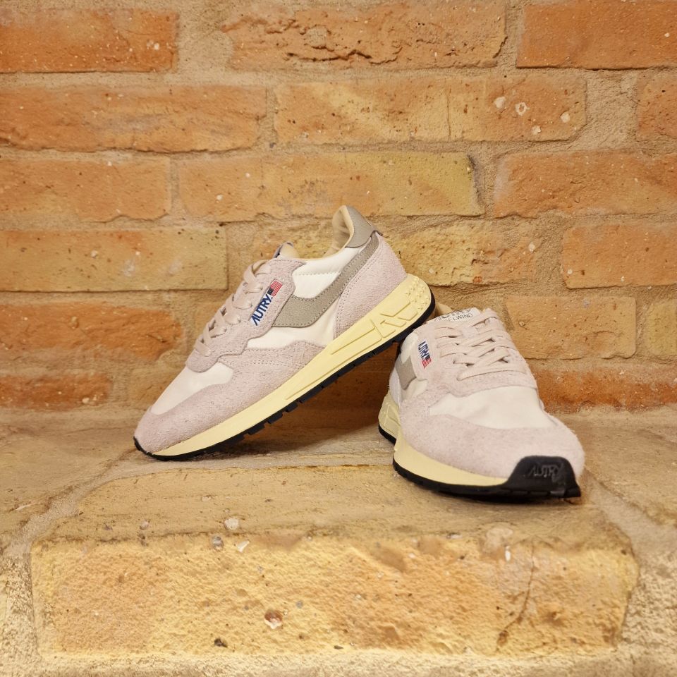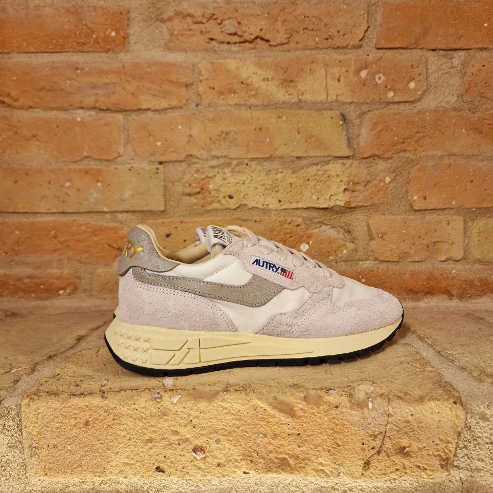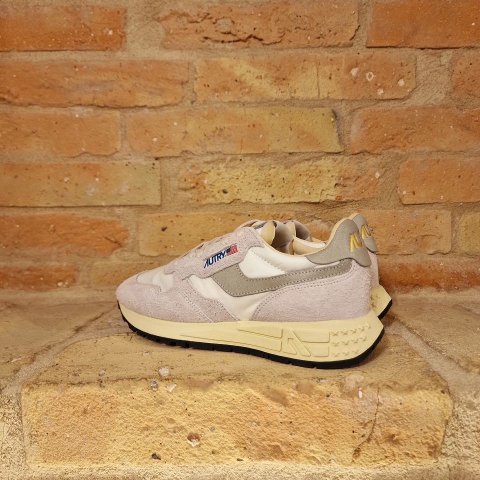 Un mix di nylon e suede white con logo sui lati in pelle grigia.