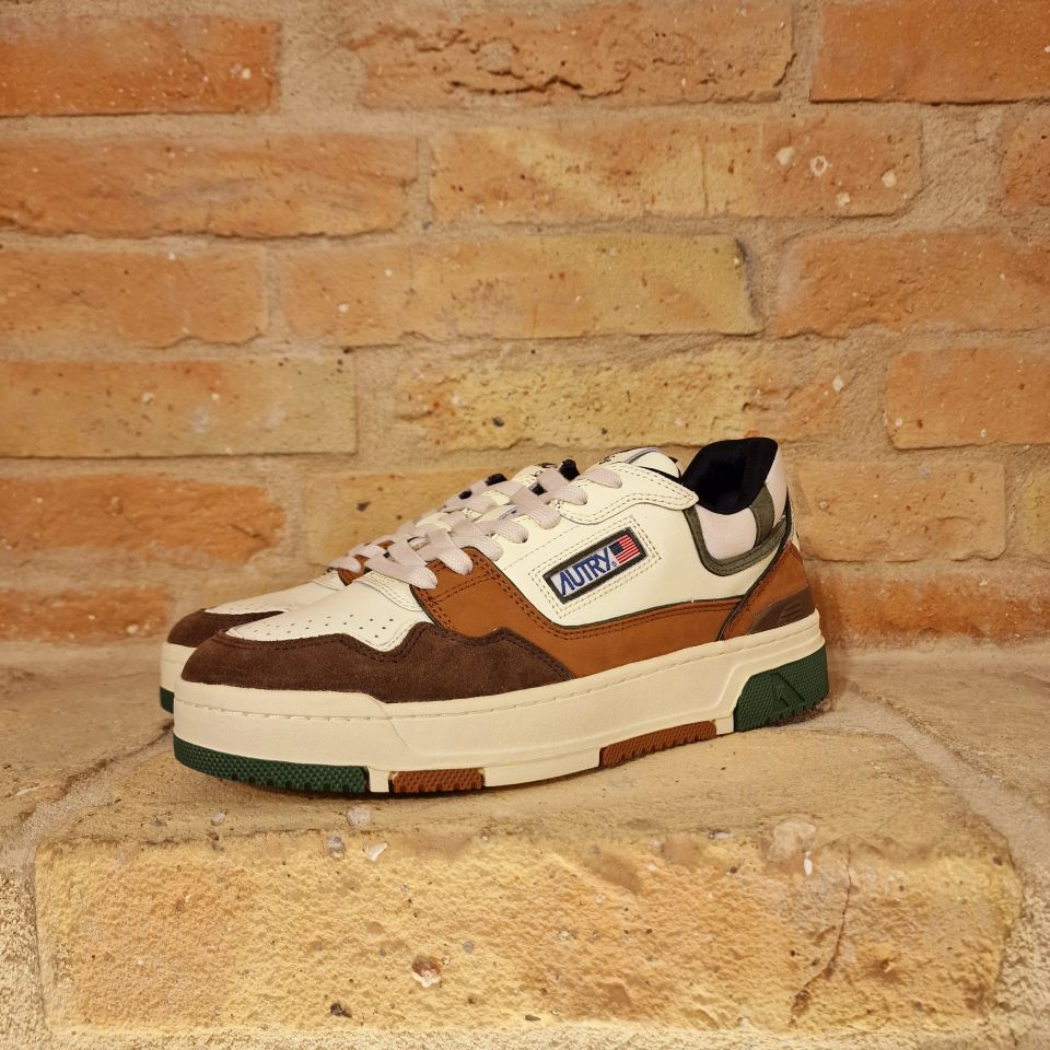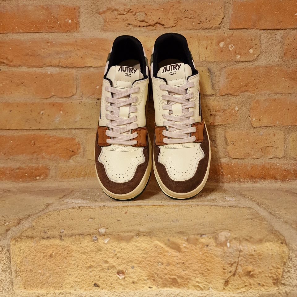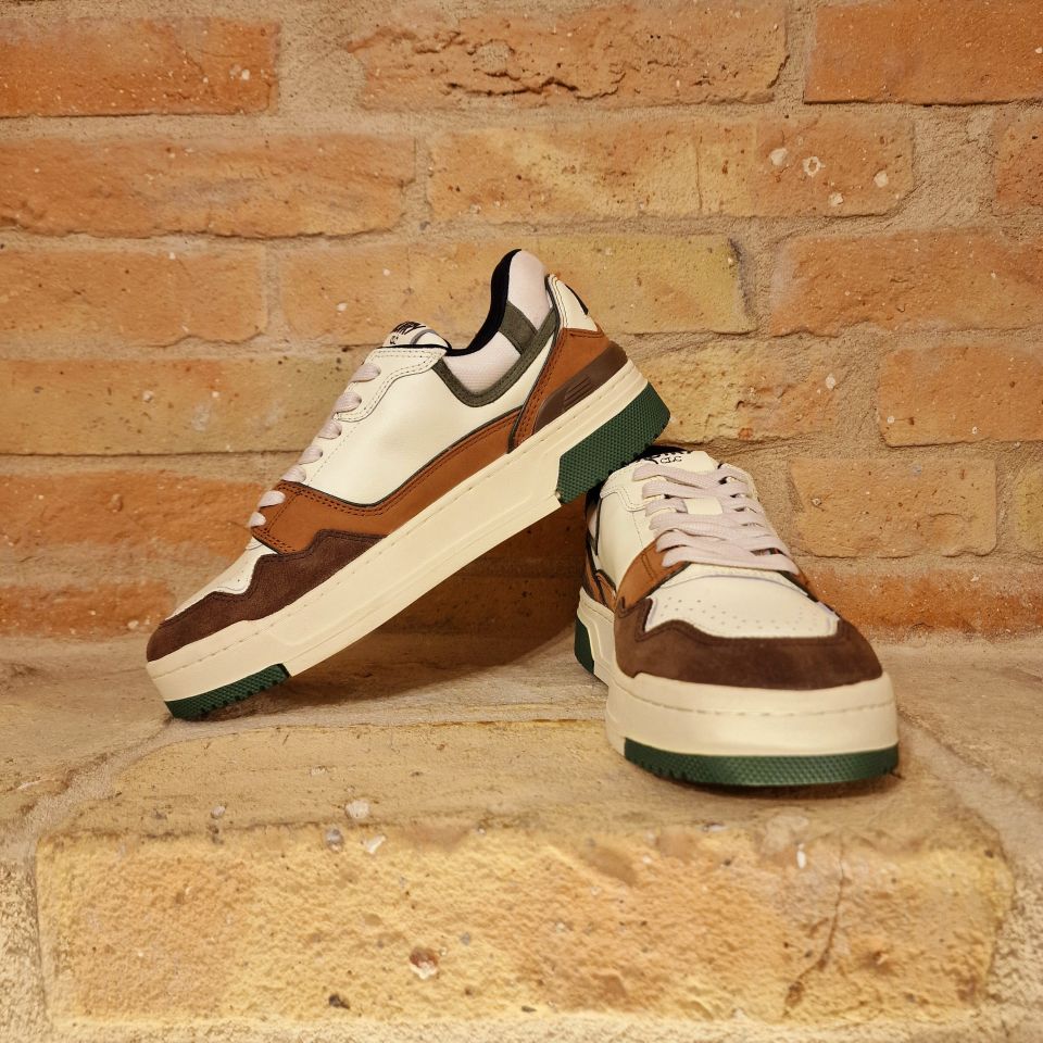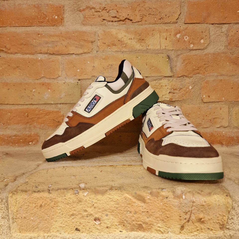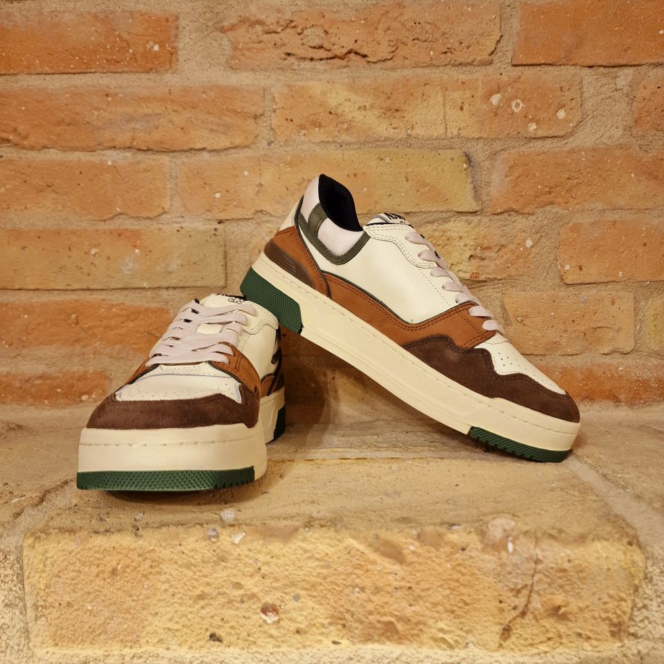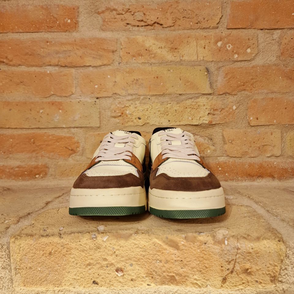 Sneakers in pelle di vitello bianca con inserti in suede e nabuk marrone.