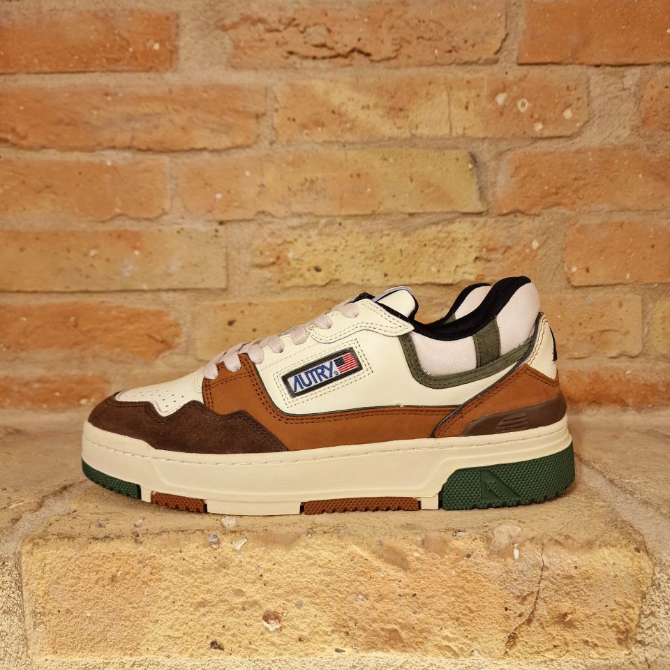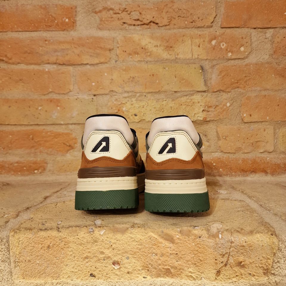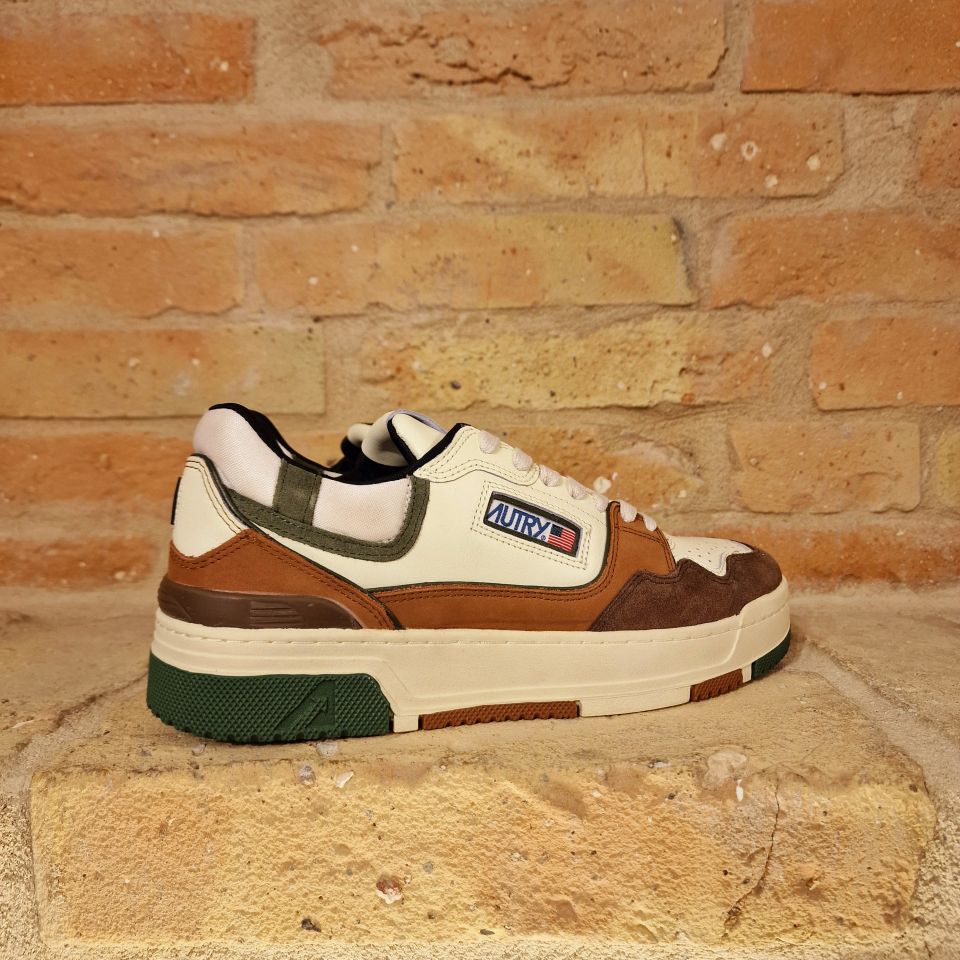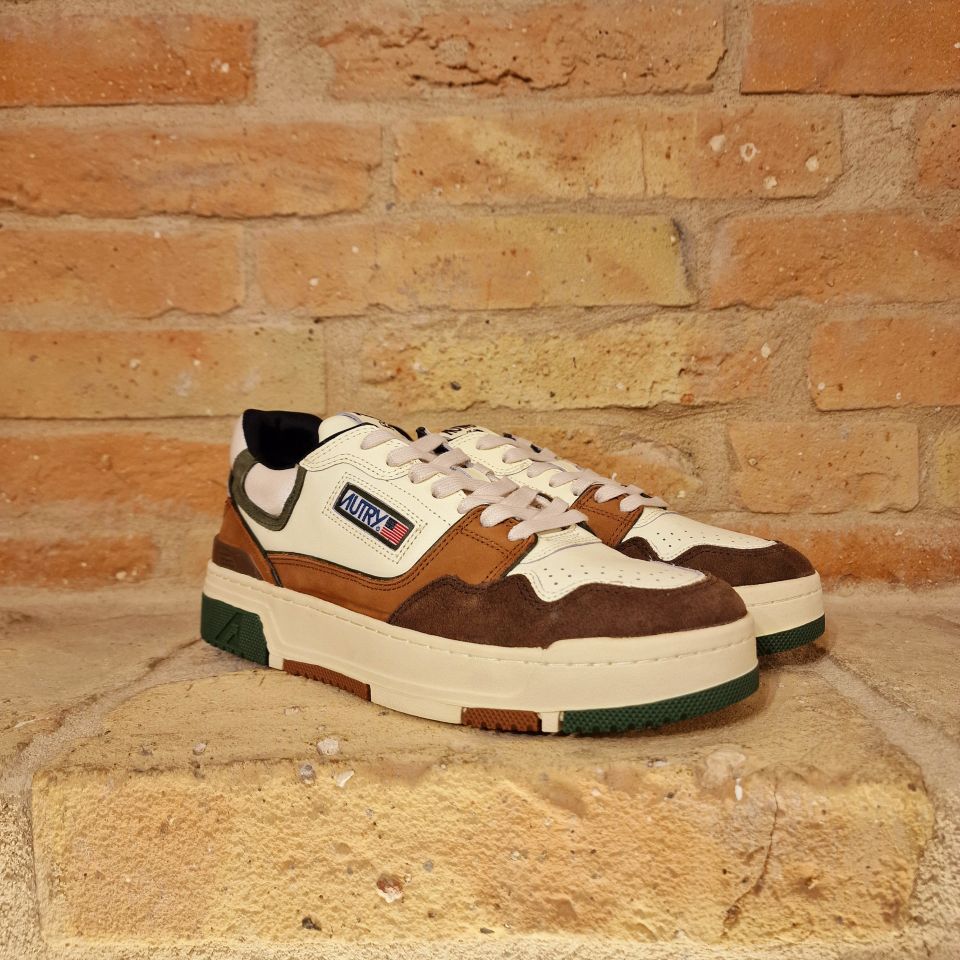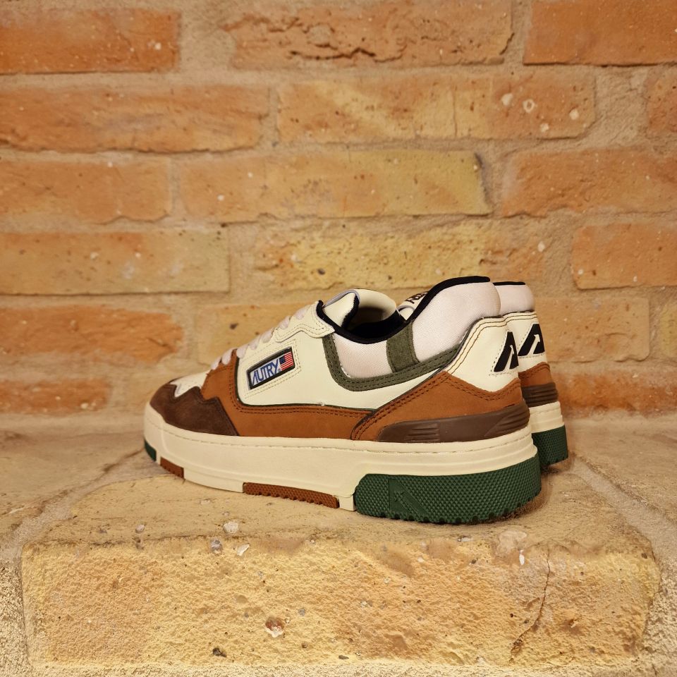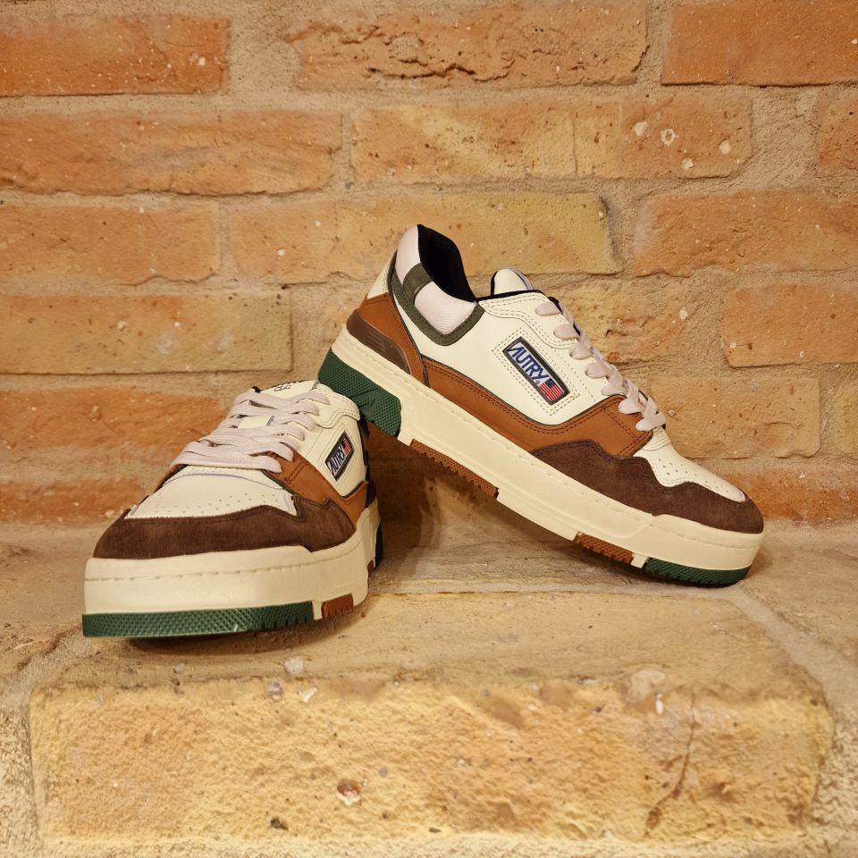 Sneakers in pelle di vitello bianca con inserti in suede e nabuk marrone.