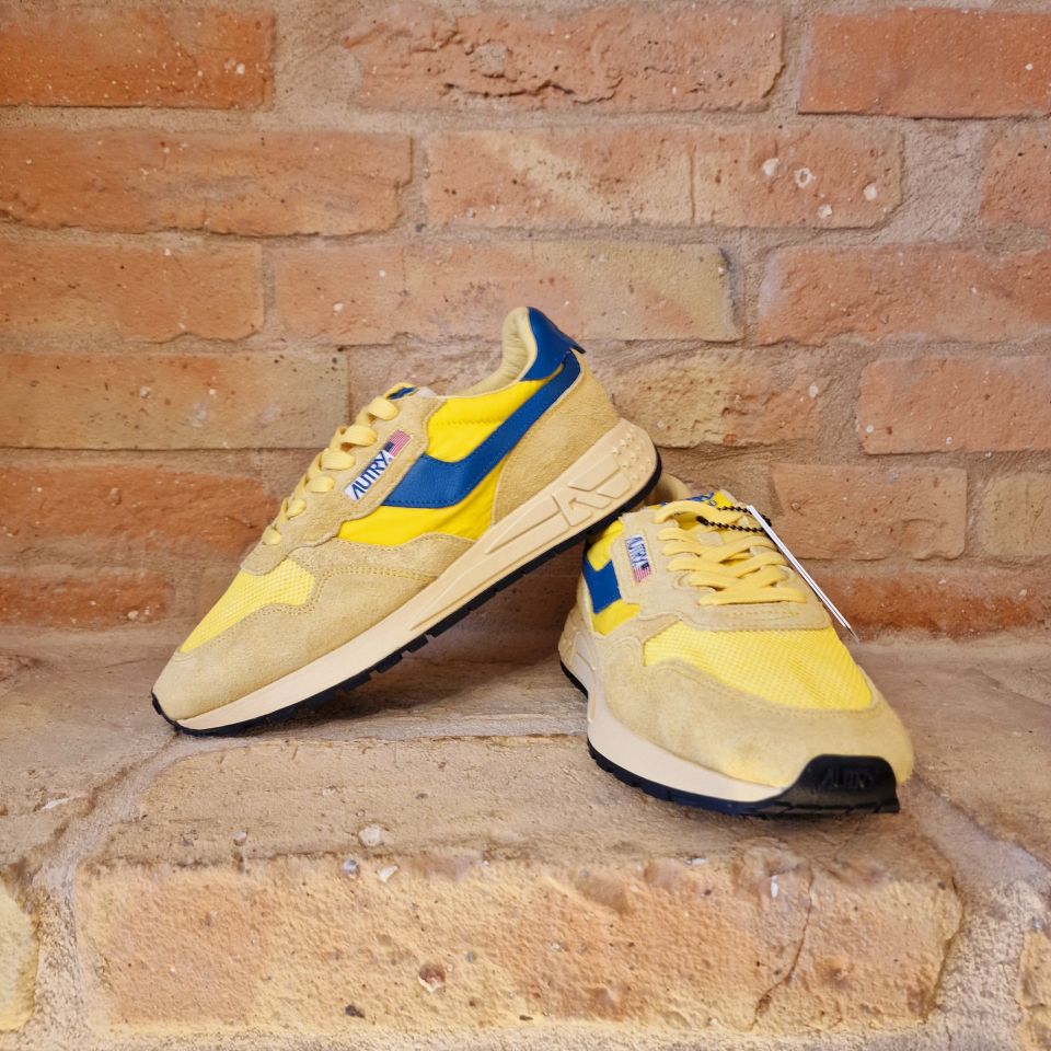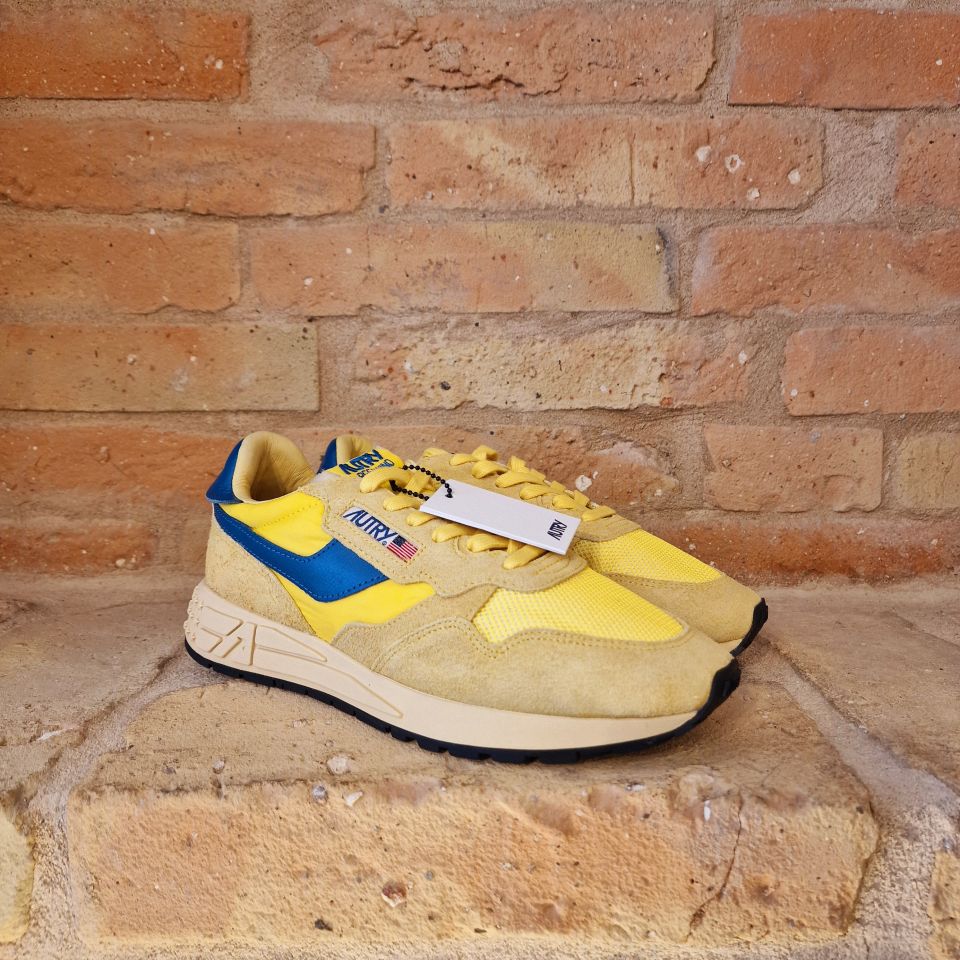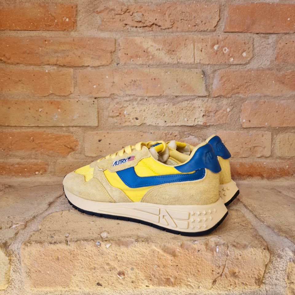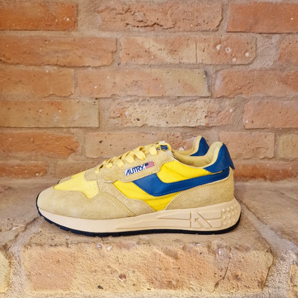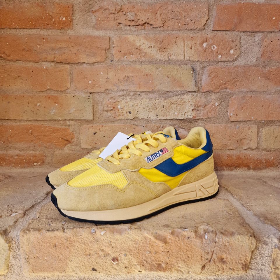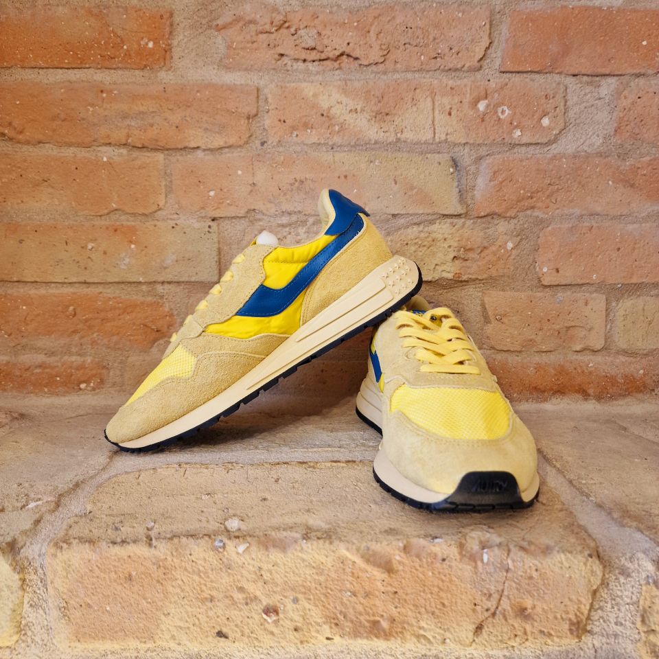 Un mix di nylon e suede giallo con logo sui lati in pelle blu.