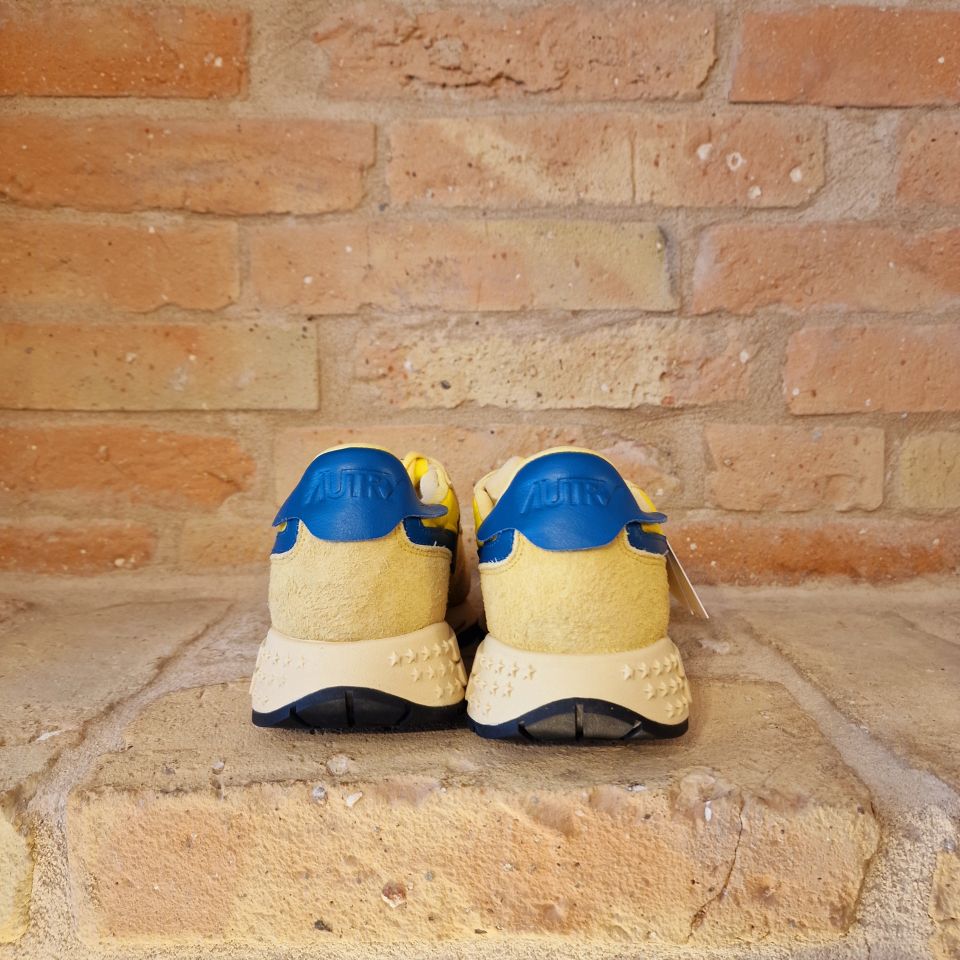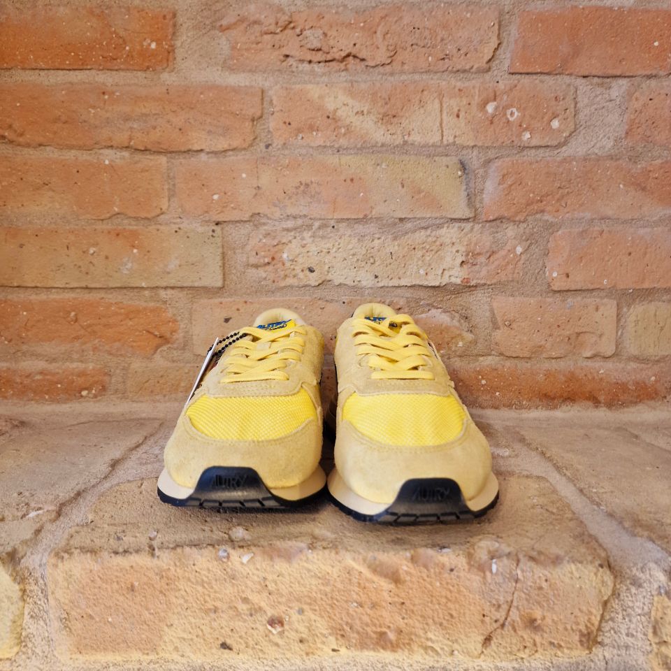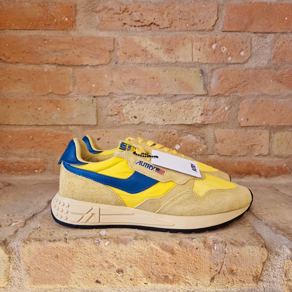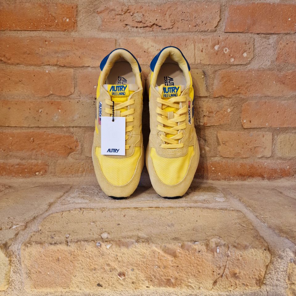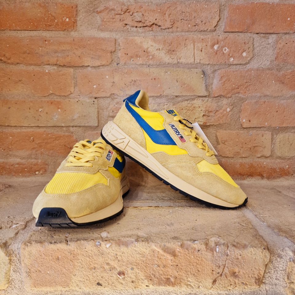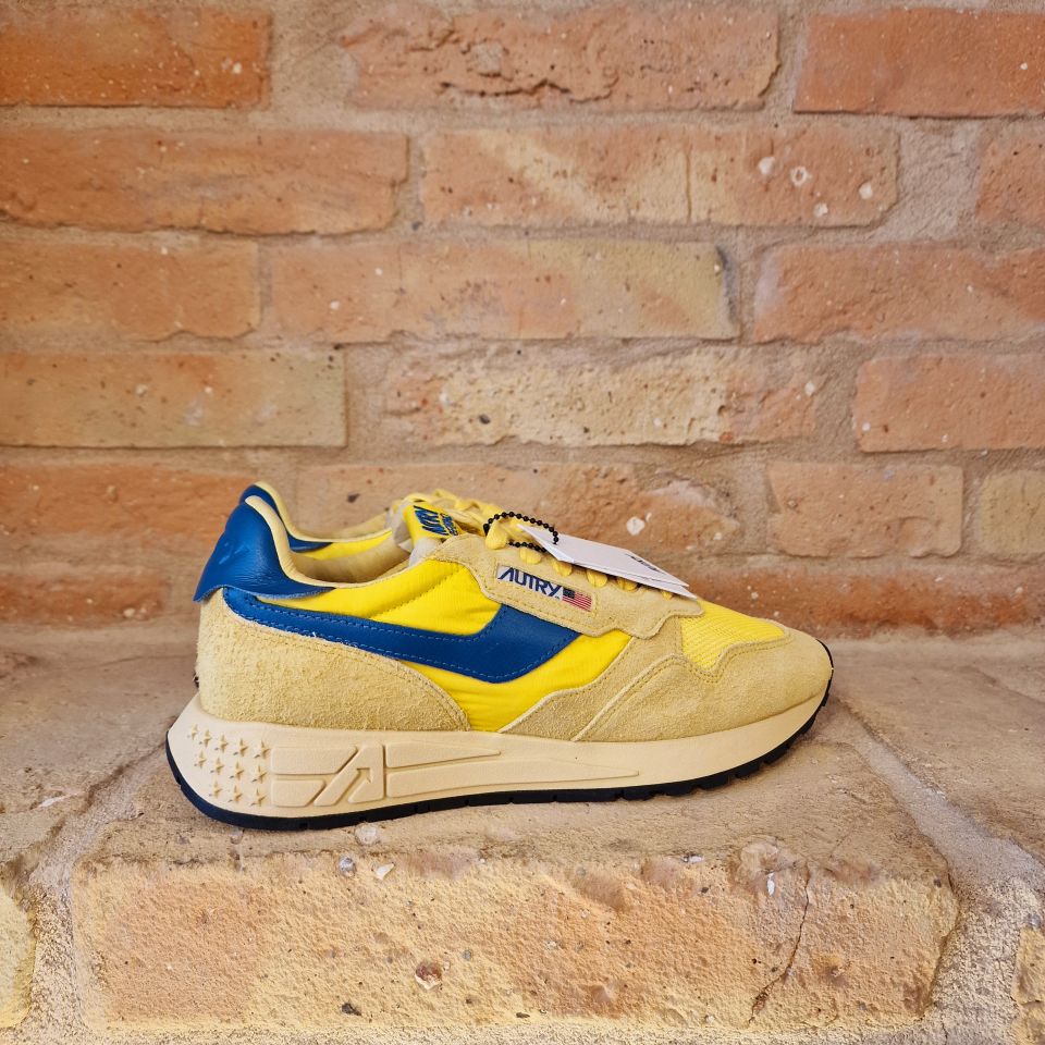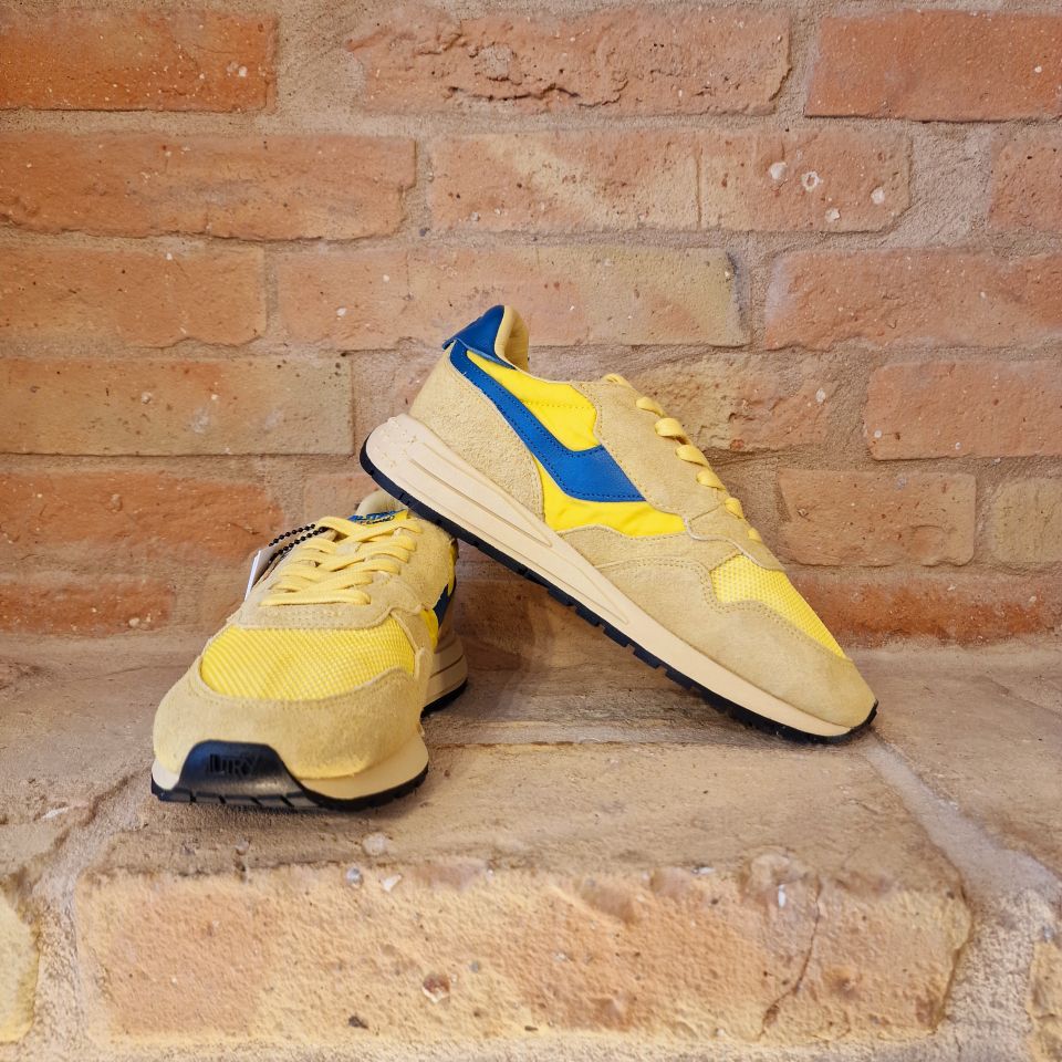 Un mix di nylon e suede giallo con logo sui lati in pelle blu.