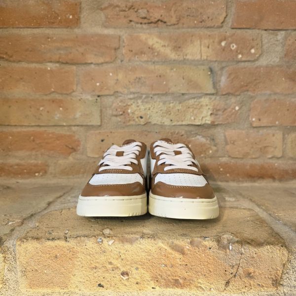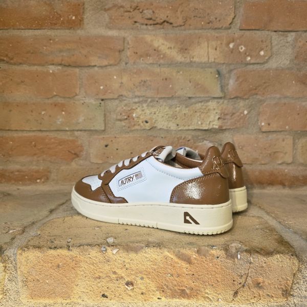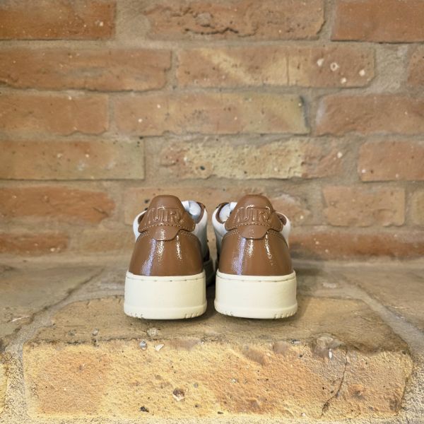 Sneakers in pelle di vitello bianca con inserti in vernice marrone.